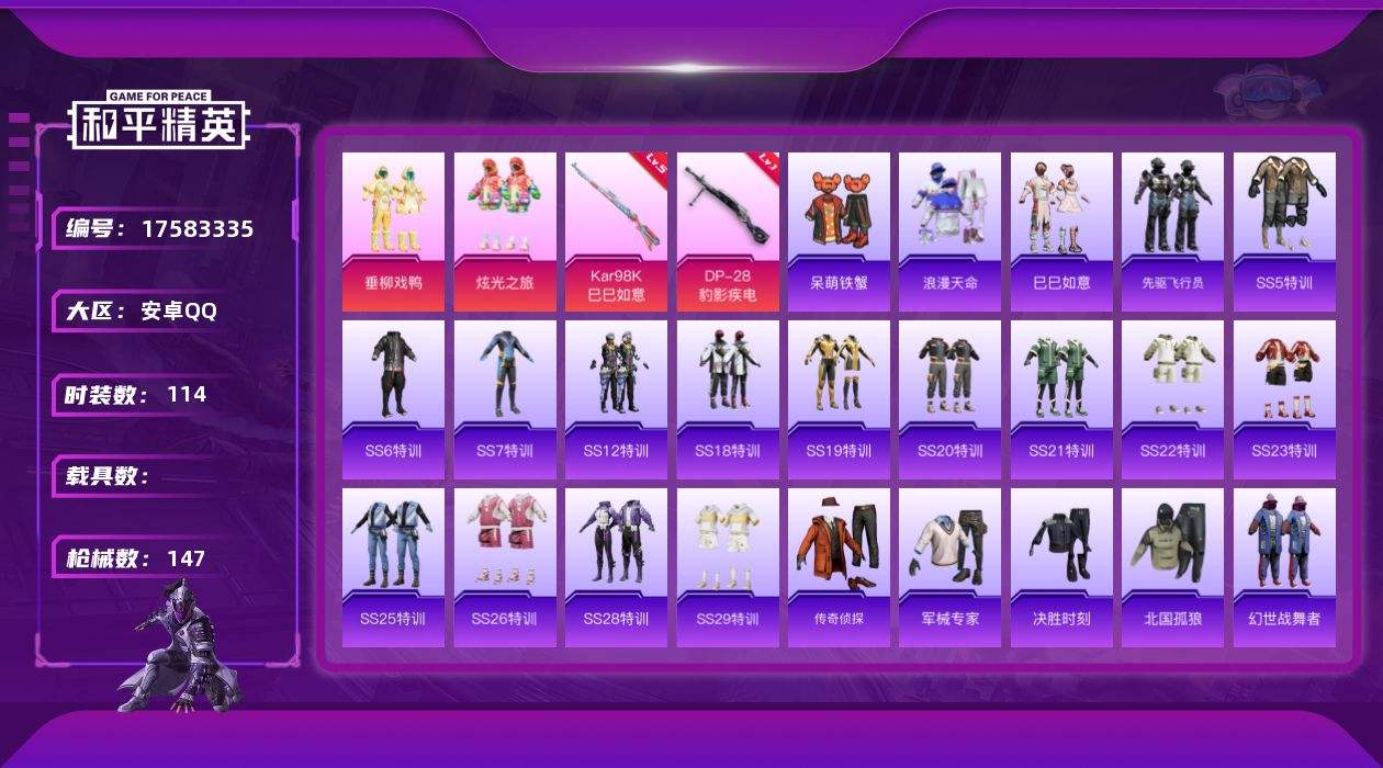 【548496】[17583335]安卓 手Q-3粉装-5特效枪-0载具-1粉色飞行器-45362热力值-6王牌印记-114套装-147枪皮【热门品类】:套装-浪漫天命【粉色套装】:粉装-垂柳戏鸭,粉装-炫光之旅,角色-辉云木星【粉色枪皮等级】:ACE32-萌骑漫游(四级),AKS-74U-森灵之息(五级),Kar98K-巳巳如意(五级),Mk14-福马献瑞(五级),DP-28-豹影疾电(一级)