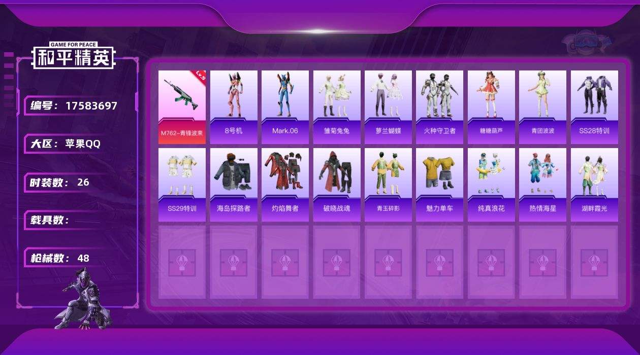 【548532】[17583697]苹果【小号 角色-8号机,角色-Mark.06,M762-青锋波束(五级)】 手Q-0粉装-1特效枪-0载具-0粉色飞行器-11586热力值-1王牌印记-26套装-48枪皮【热门品类】:角色-8号机,角色-Mark.06【粉色枪皮等级】:M762-青锋波束(五级)【粉色枪皮】:M762-青锋波束【粉色降落伞】:精灵梦叶罗丽降落伞,未来领航者降落伞【稀有套装】: