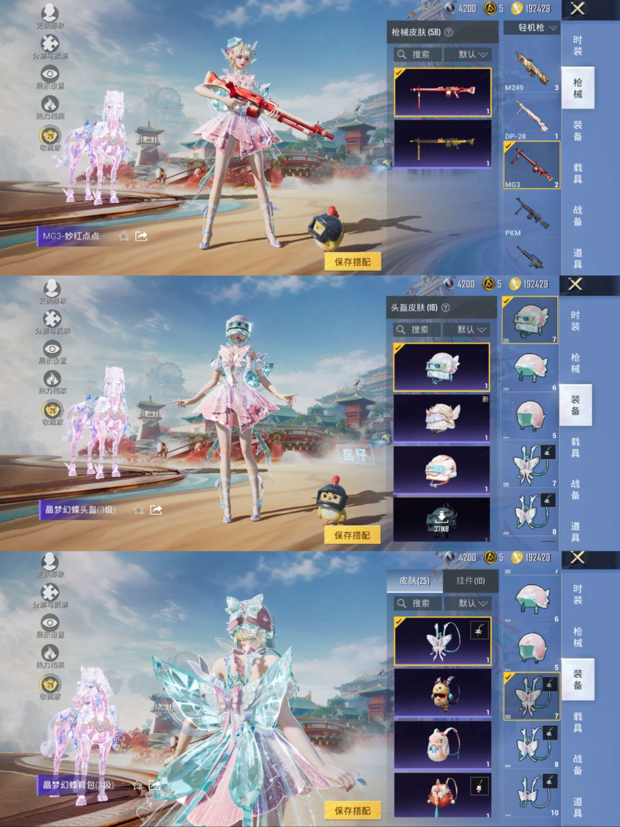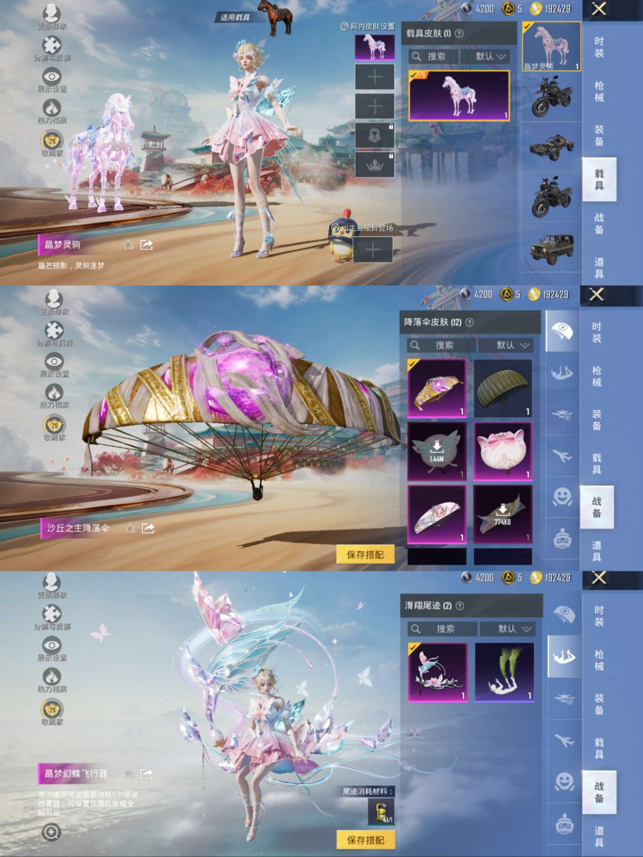 【548589】【1载具】 晶梦灵驹 【2粉装】 角色-千金淑猫 角色-晶梦幻蝶 【3特效枪】 M16A4-晶梦幻蝶 1级 Kar98K-巳巳如意 5级 DP-28-千金淑猫 6级 【1飞行器】 晶梦幻蝶飞行器【热门】 棉花软糖 糖糖葫芦 晶辉守护 角色-情公主 田园牧歌 轻风白浪女号素材号 有二次 安卓Q-段位黄金 37级 30套装58枪皮