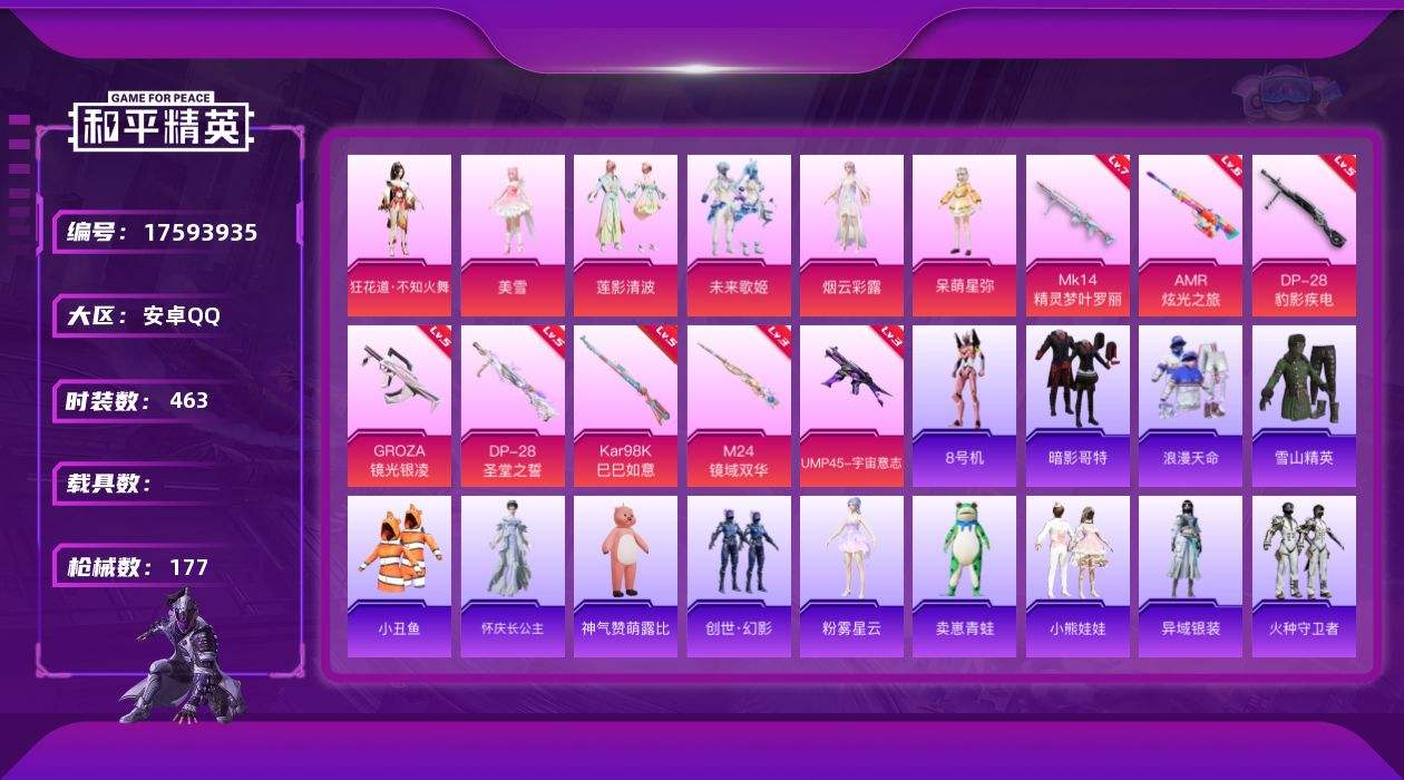 【549682】【不可二次】【安卓QQ】龟仙人 MK14-精灵梦叶罗丽 M24-镜域双华 迅捷狂鲨 DP-28-圣堂之誓 UMP45-宇宙意志 萌物绒绒飞行器 豚鼠丹丹 AMR-炫光之旅 浪漫天命 暗影哥特 雪山精英 闪光银龙飞行器