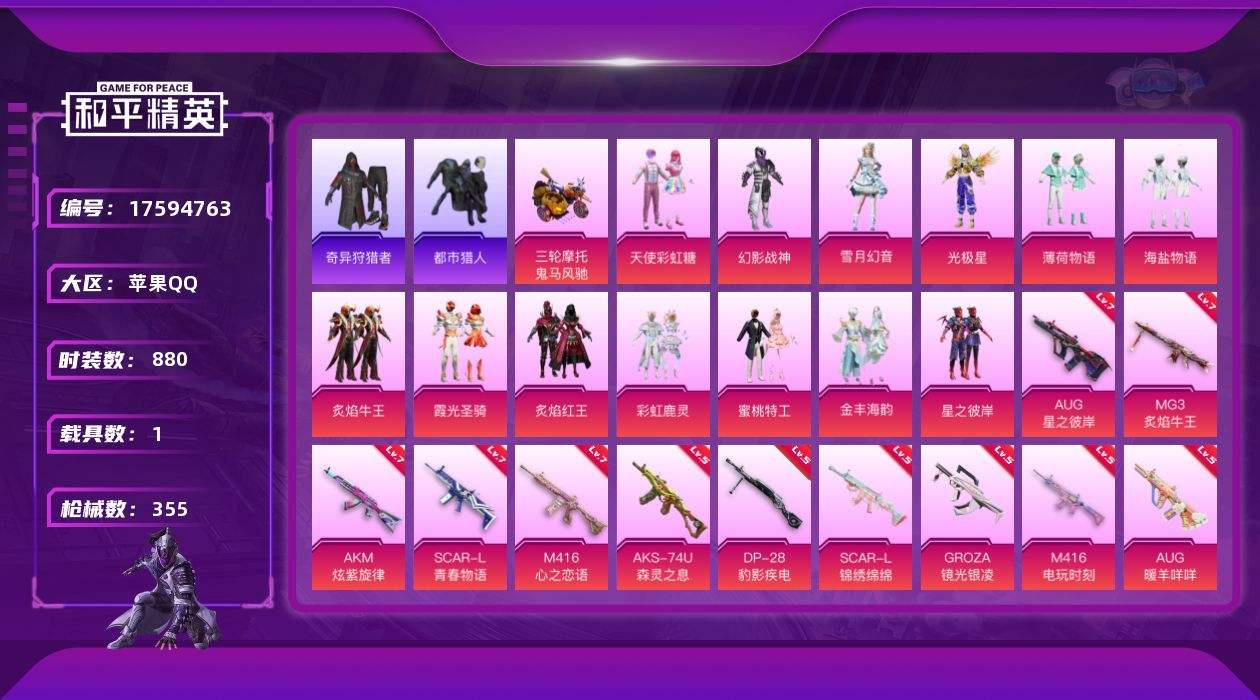 【550039】【可二次】【苹果QQ】龟仙人 漫步者 都市猎人 炙焰红王 MG3-炙焰牛王 东方飞龙 M762-奇异狩猎者 M416-电玩时刻 海盐物语 星之彼岸 M416-心之恋语 M416-快乐主宰 瑞龙福将 AUG-星之彼岸 浪漫天命 团圆交子 AKM-奇异狩猎者 迅捷狂鲨 奇异狩猎者 M762-瑞龙福将 狂沙舞者 彩虹鹿灵 青春物语飞行器 M416-墨龙九天 SCAR-L-锦绣绵绵 AK