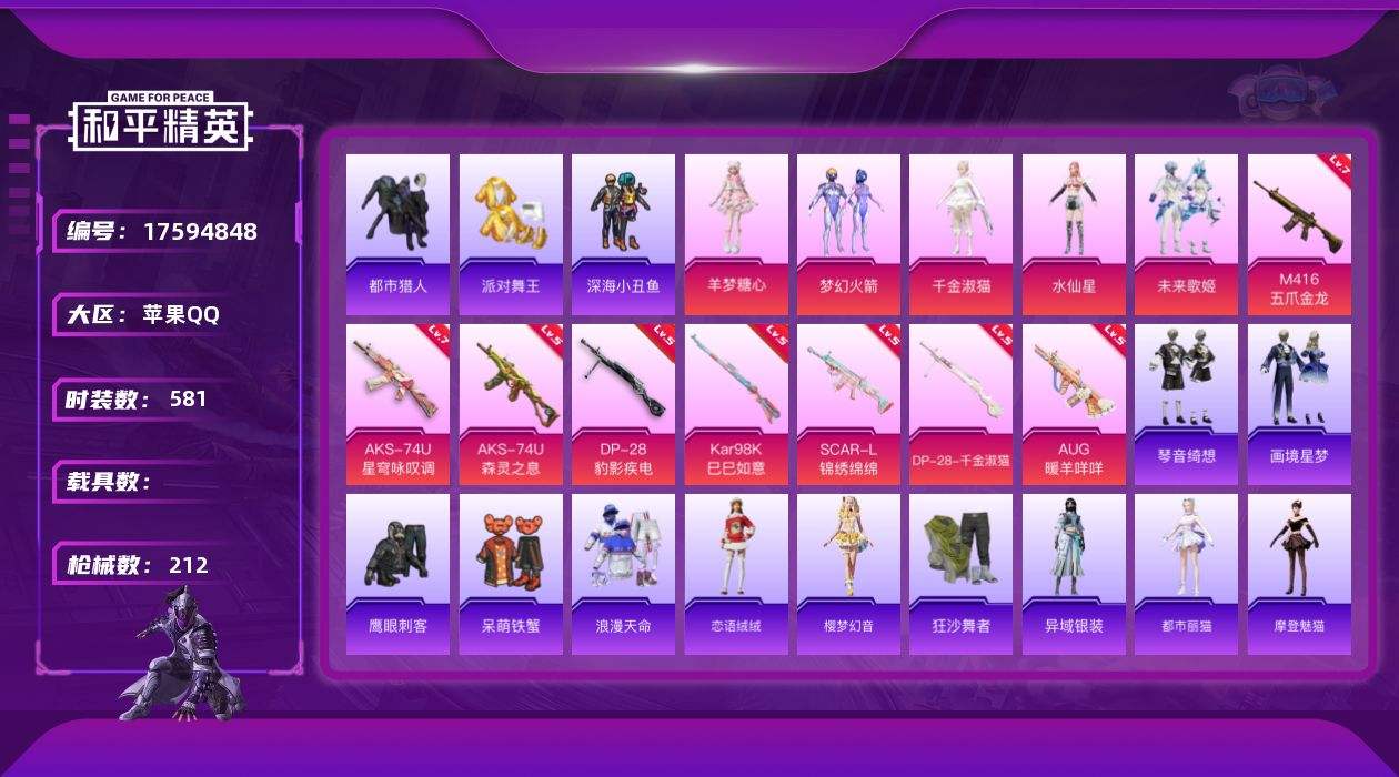 【550078】【可二次】【苹果QQ】SCAR-L-锦绣绵绵 龟仙人 梦幻火箭 M416-五爪金龙 漫步者 都市猎人 深海小丑鱼 派对舞王 绝色倾城飞行器 狂沙舞者 浪漫天命