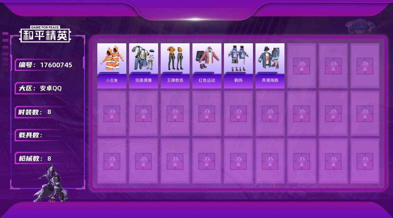 【551311】[17600745]【FK6508】8套装/枪械1/装备8/战备17/热力值2393/五级Mk14-福马献瑞/小丑鱼/Mk14-福马献瑞/辉云木星降落伞/套装-马上有钱/AUG-耀粉歌者/蜜獾-天降萌叽/完美偶像/王牌教练/红色运动/鹤鸣/弄潮海豚/深海小丑鱼头盔(2级)