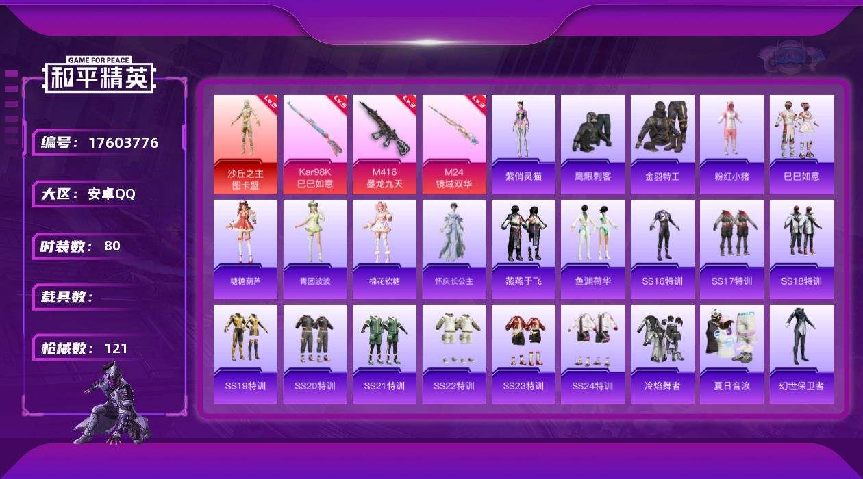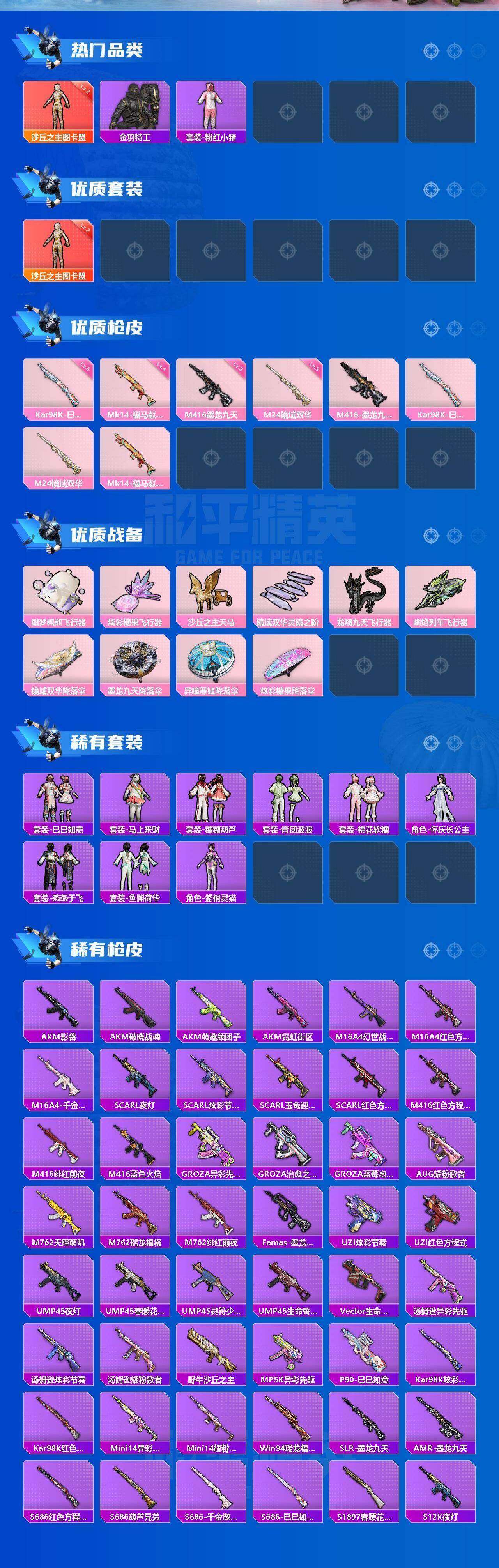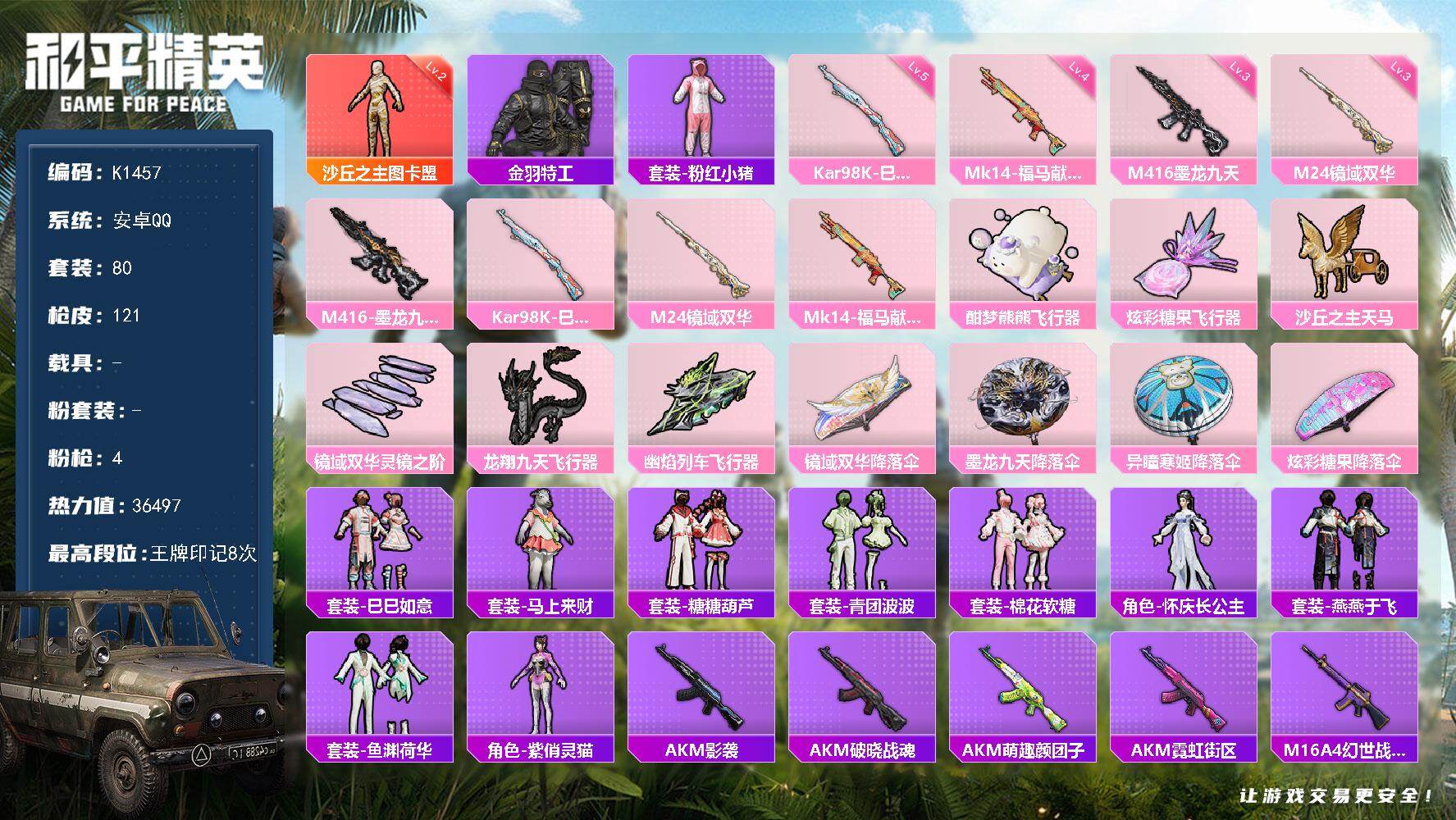 【551509】[17603776]K1457/可二次/安卓qq/【1神装-4特效枪-6粉色飞行器-36497热力值-8王牌印记-80套装-121枪皮】【沙丘之主-图卡盟(二级)】/套装-金羽特工/套装-粉红小猪/M416-墨龙九天(三级)/Kar98K-巳巳如意(五级)/M24-镜域双华(三级)/Mk14-福马献瑞(四级)/酣梦熊熊飞行器/炫彩糖果飞行器/沙丘之主天马/镜域双华-灵镜之阶/龙翔