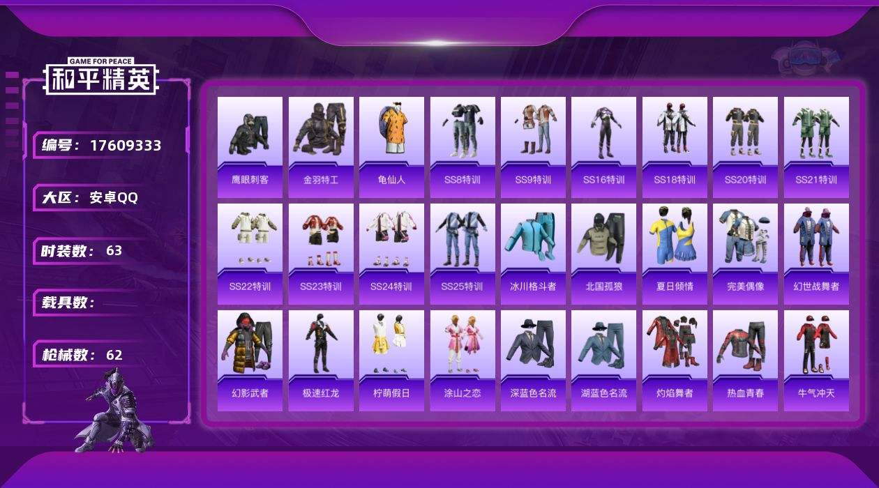 【552088】[17609333]【FK6523】63套装/装备55/战备49/热力值19305/金羽特工/龟仙人/古堡领主降落伞/银刃赛罗降落伞/未来歌姬降落伞/AKM-彩虹符号/AKM-破晓战魂/SCAR-L-玉兔迎春/SCAR-L-红色方程式/SCAR-L-银碳小老虎/M416-糯团青竹/M416-红色方程式/M416-蓝色火焰/GROZA-影袭/GROZA-田园牧歌/AUG-天降萌叽/