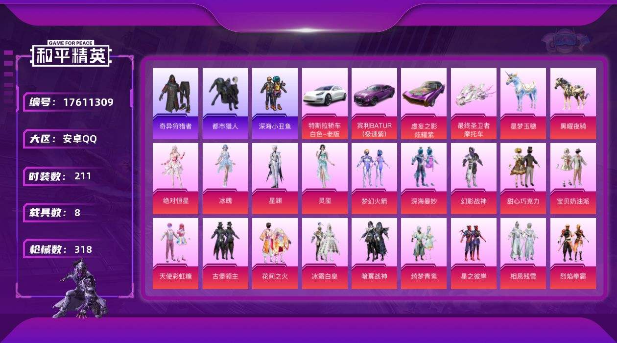 【552264】【不可二次】【安卓QQ】UZI-绮梦青鸾 平底锅-林间仙鹿 暗翼战神 大橘为重 特斯拉3银色 AWM-橘柚倾心 林间仙鹿 Mini14-龙虾霸霸 红伞翩翩 M416-心之恋语 深海小丑鱼 山涧鹿灵 AKM-甜心宝贝 98K-伏魔团 深海曼妙 VSS-烈焰拳霸 黑伞漫漫 奇异狩猎者 98K-暗翼战神 Vector-红伞翩翩 SCAR-机甲封神 MG3-洛神天依 甜心巧克力 彩虹鹿灵
