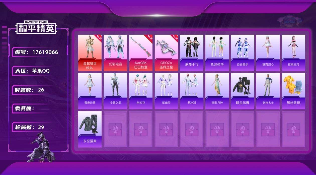【552953】[17619066]苹果【红装号 金蛇镇世-烛九/粉装-幻彩电音/GROZA-圣辉之星/Kar98K-巳巳如意】 手Q-1神装-1粉装-2特效枪-0载具-2粉色飞行器-13960热力值-2王牌印记-26套装-39枪皮【红色神装等级】:金蛇镇世-烛九(二级)【红色角色神装】:金蛇镇世-烛九【粉色套装】:粉装-幻彩电音【粉色枪皮等级】:GROZA-圣辉之星(三级),Kar98K-巳巳