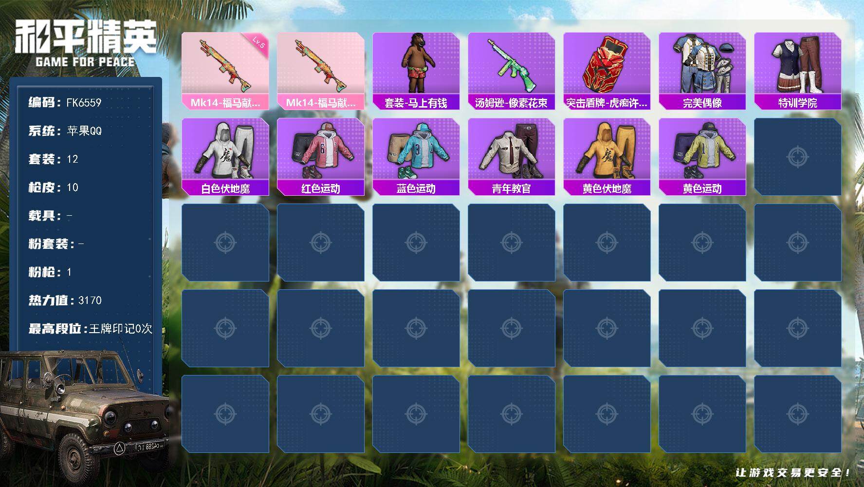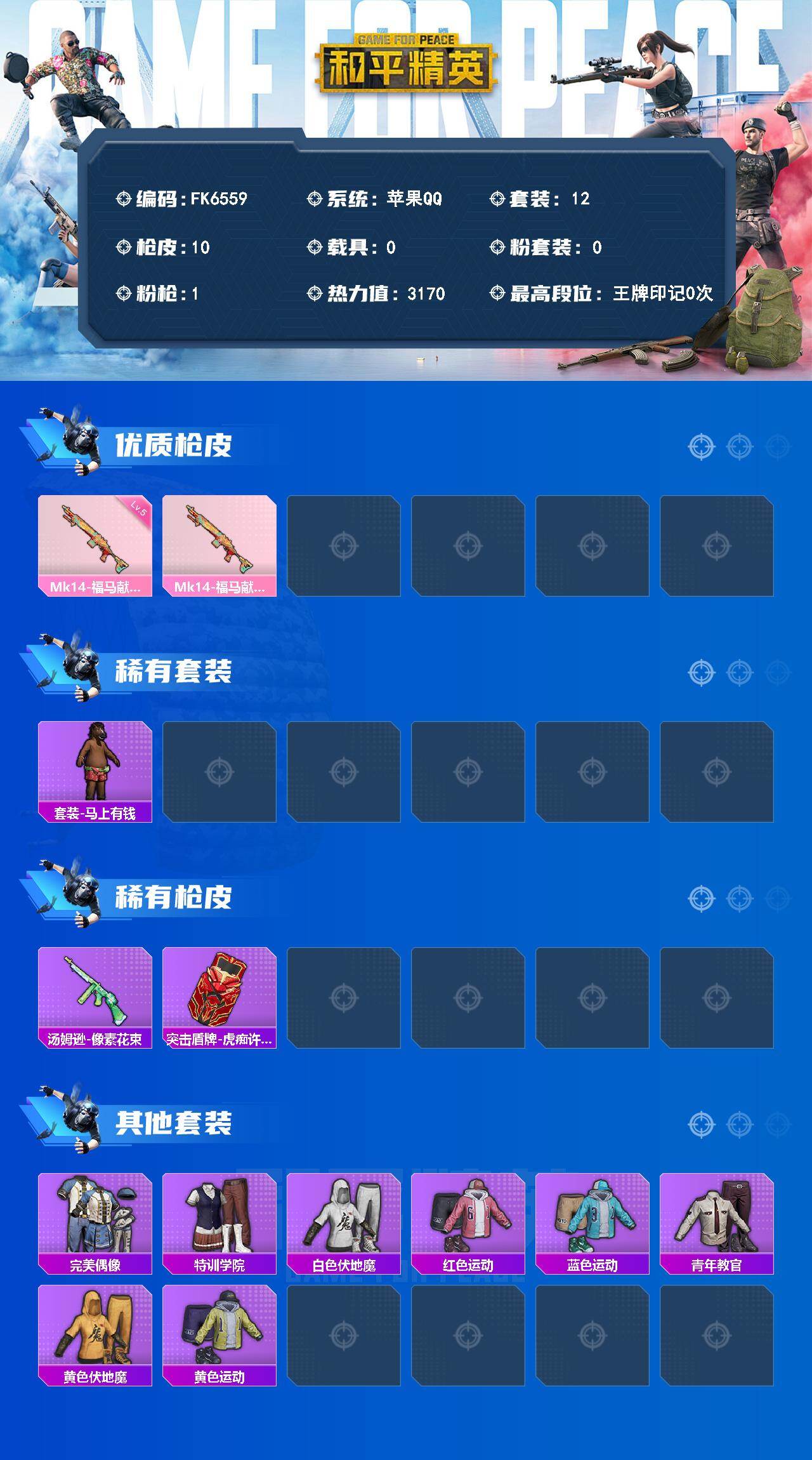 【553228】[17621159]【FK6559】12套装/枪械1/装备16/战备17/热力值3170/五级Mk14-福马献瑞/Mk14-福马献瑞/套装-马上有钱/汤姆逊-像素花束/突击盾牌-虎痴许褚/完美偶像/特训学院/白色伏地魔/红色运动/蓝色运动/青年教官/黄色伏地魔/黄色运动