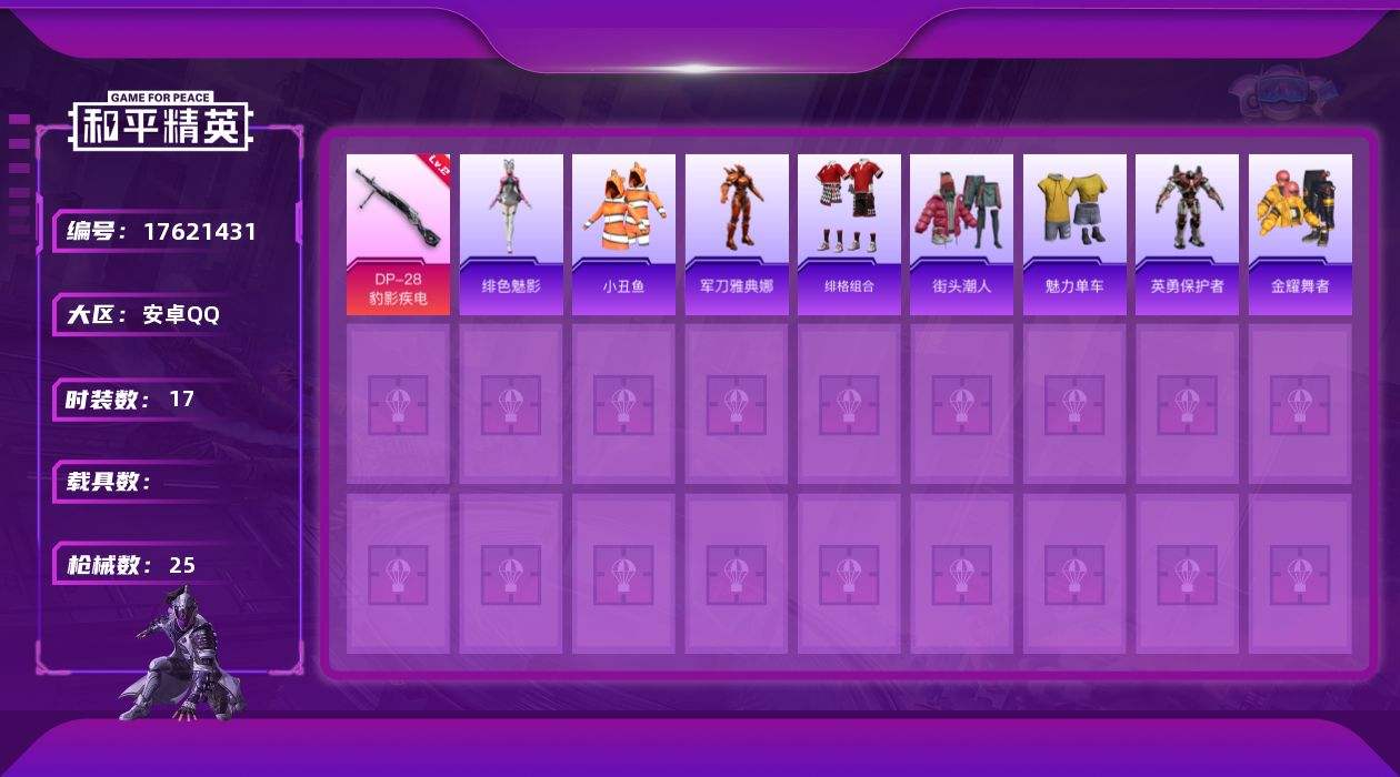 【553257】[17621431]【FK6561】17套装/枪械3/装备31/战备19/热力值6405/二级UMP45-萌骑冒险/二级Mk14-福马献瑞/二级DP-28-豹影疾电/小丑鱼/军刀雅典娜/UMP45-萌骑冒险/Mk14-福马献瑞/DP-28-豹影疾电/星之彼岸降落伞/辉光之愿降落伞/套装-马上有钱/绯色魅影/套装-雨过天青/套装-红釉青花/AKM-破晓战魂/M416-蓝色火焰/AU