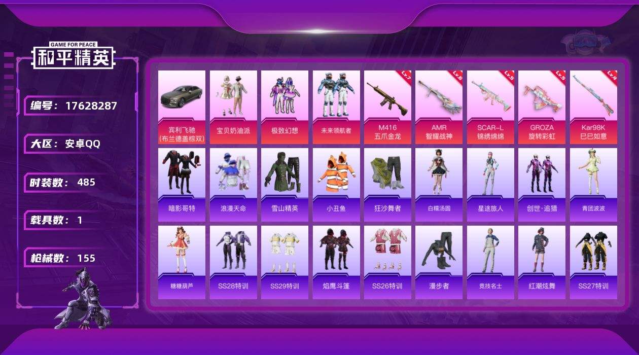 【554316】【不可二次】【安卓QQ】龟仙人 M416-五爪金龙 漫步者 迅捷狂鲨 极致幻想 狂沙舞者 豚鼠丹丹 SCAR-L-锦绣绵绵 浪漫波比 宝贝奶油派 GROZA-旋转彩虹 浪漫天命 暗影哥特 雪山精英 激萌罗小黑 AKM-奇异狩猎者 闪光银龙飞行器