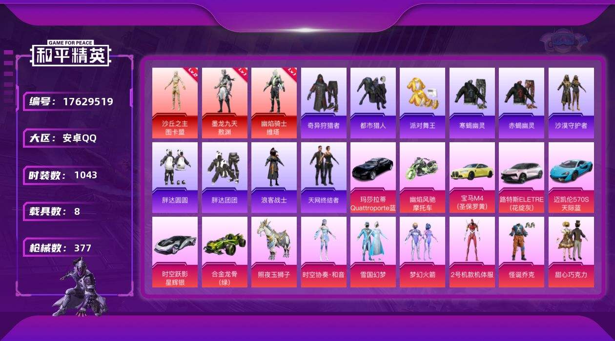 【554669】【可二次】【安卓QQ】龟仙人 AKM-绿萝繁花 水银刺客 金曜白虎 M416-星际漫游 花间之火 都市猎人 豚鼠丹丹 忍者信条 寒蝎幽灵 沙丘之主-图卡盟 M416-至情至圣 M416-心之恋语 缤纷油彩 时空跃影(星辉银) 馨动时刻 GROZA-旋转彩虹 AKM-甜心宝贝 星之信仰 SCAR-L-梦幻火箭 怪诞乔克 迅捷狂鲨 潮萌小黄鸭 SCAR-L-锦绣绵绵 AKM-炫紫旋律