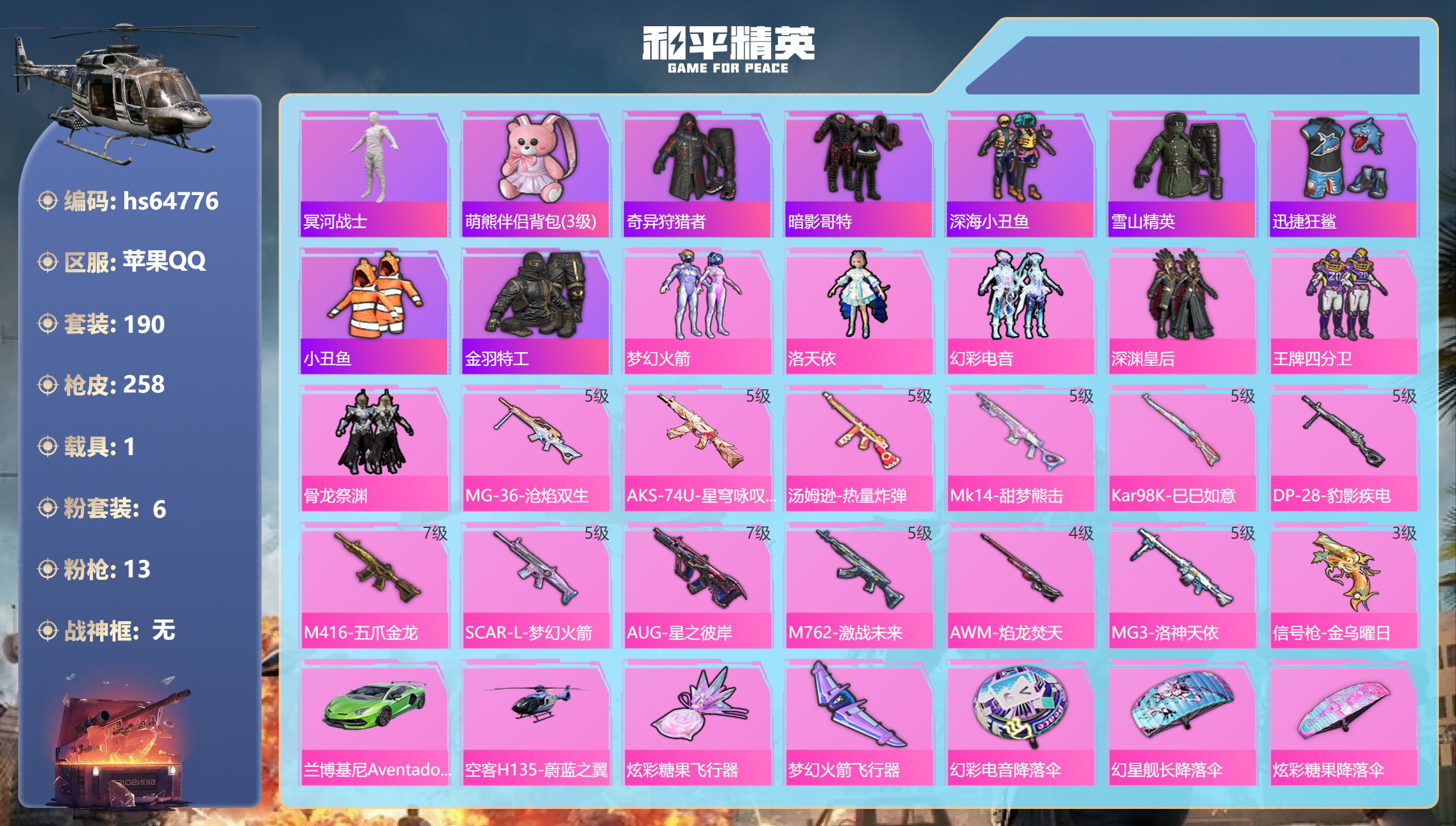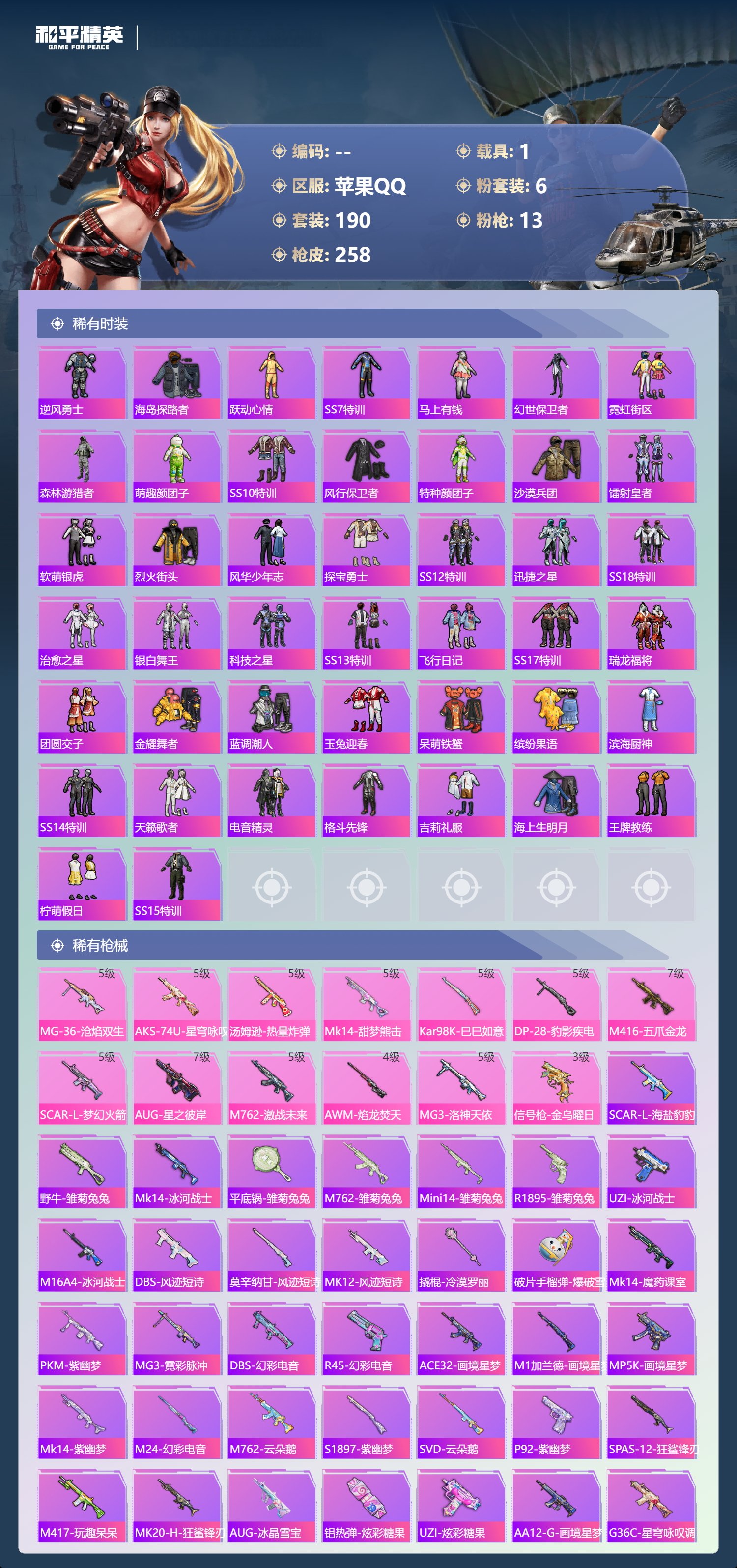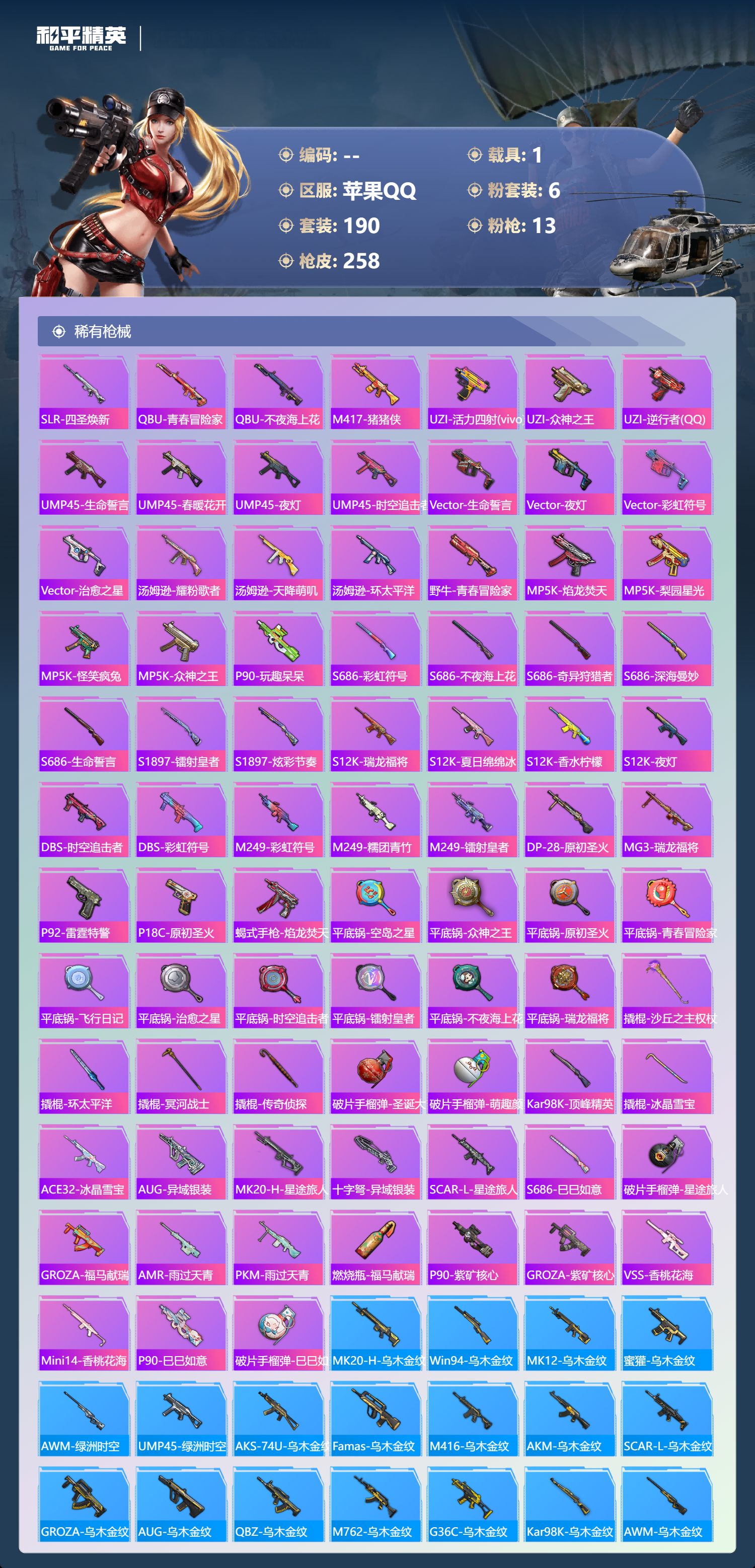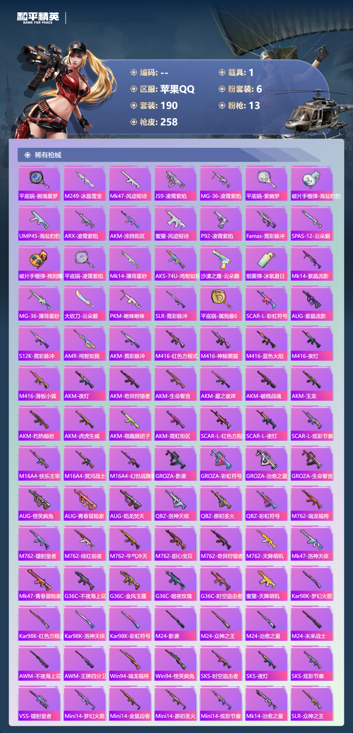 【556013】【不可二次】【苹果QQ】木乃伊 S686-奇异狩猎者 深渊皇后 M416-五爪金龙 王牌四分卫 洛天依 AWM-焰龙焚天 M762-奇异狩猎者 空客蔚蓝之翼 巡查衣 深海小丑鱼 瑞龙福将 AUG-星之彼岸 骨龙祭渊 梦幻火箭飞行器 纯白誓言 团圆交子 AKM-奇异狩猎者 软萌银虎 SCAR-L-梦幻火箭 兰博SVJ绿色 M762-激战未来 迅捷狂鲨 奇异狩猎者 M762-瑞龙福将