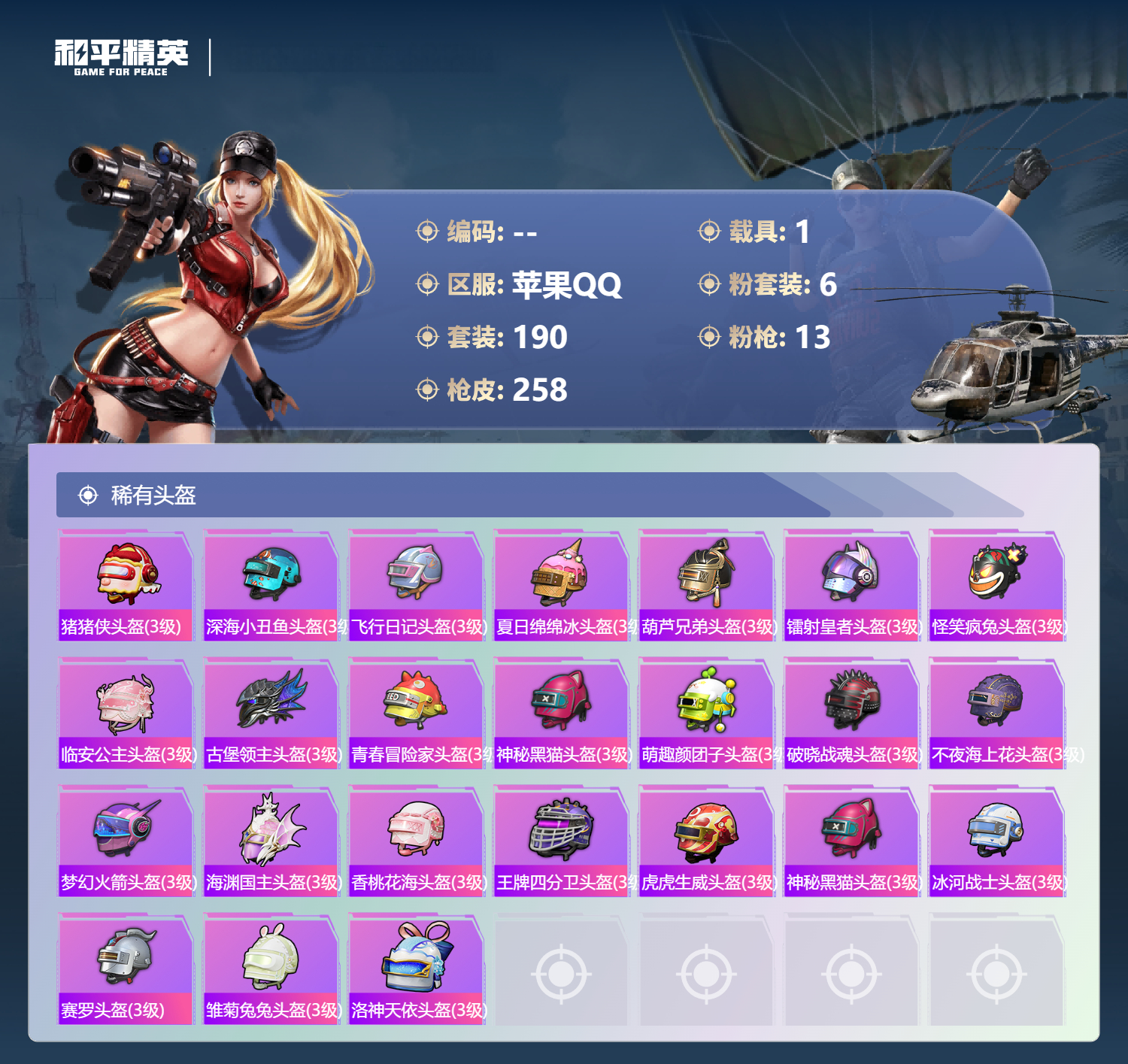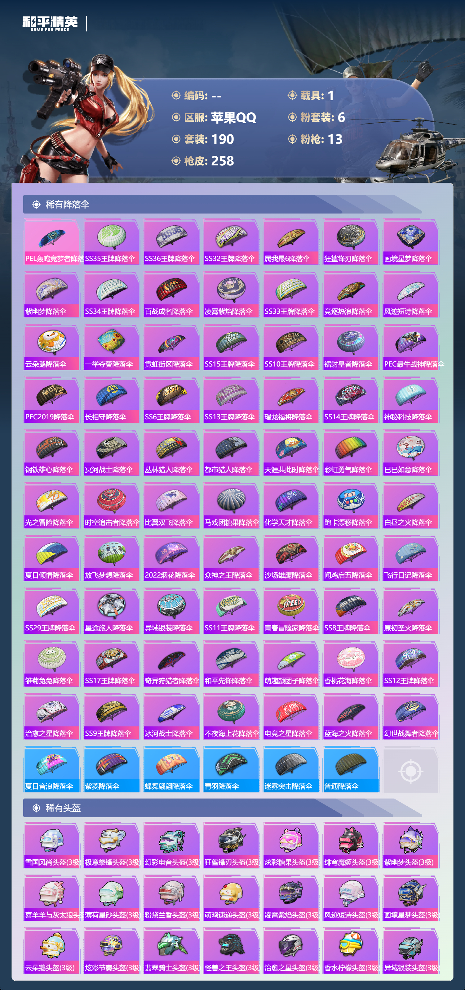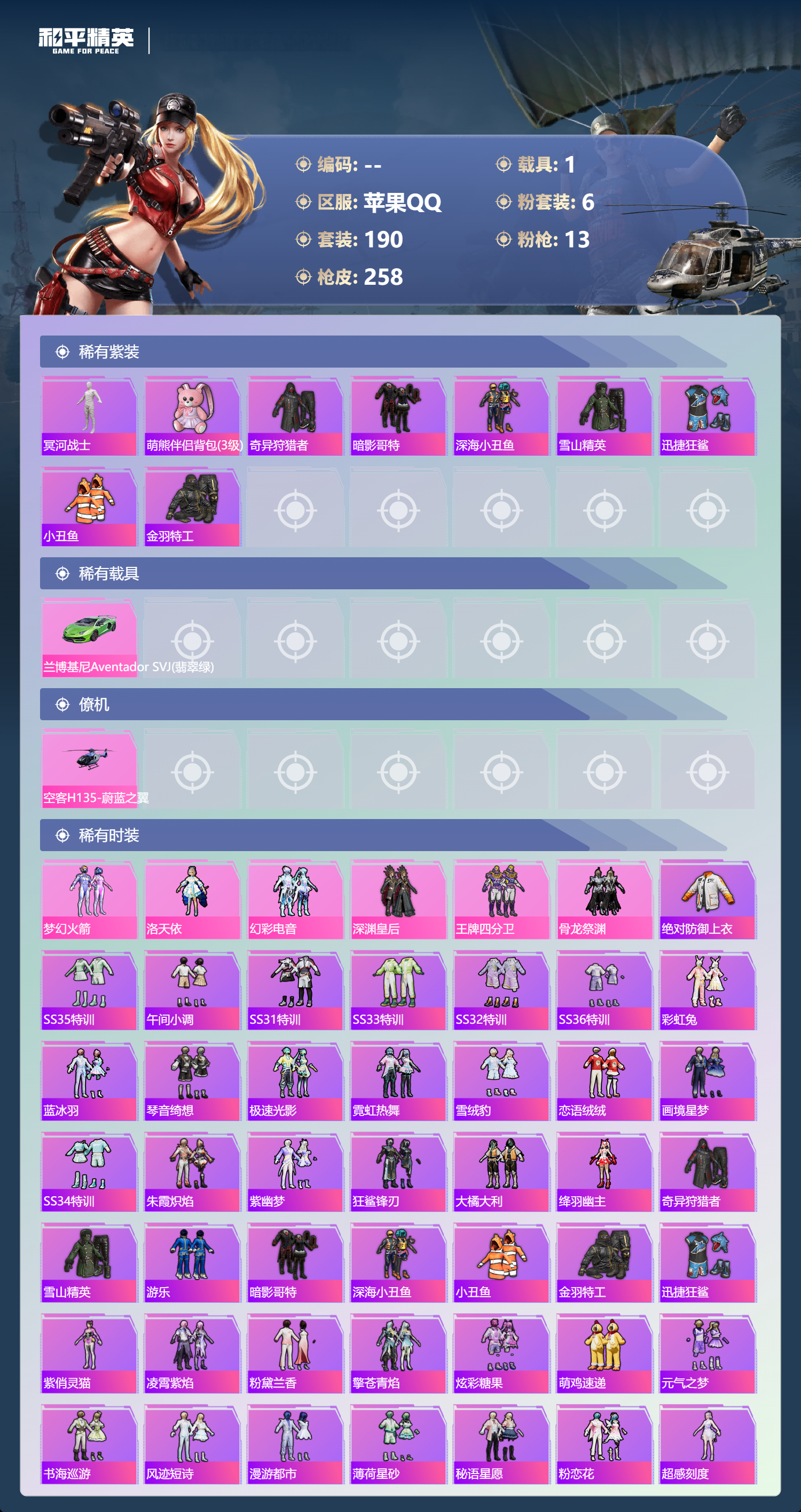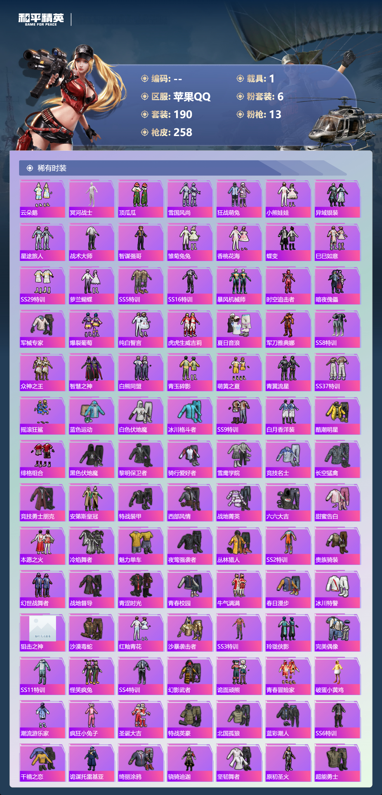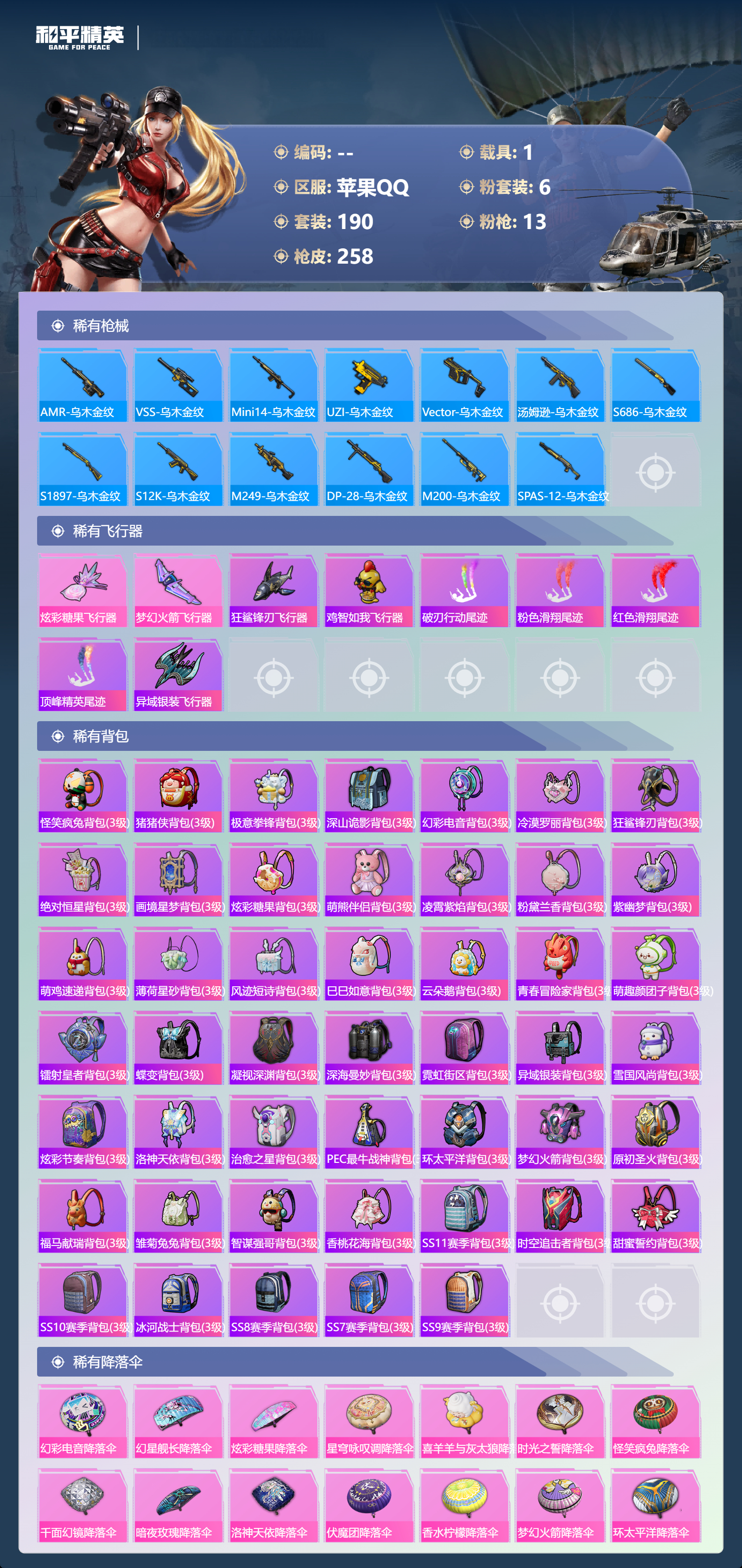 【556013】【不可二次】【苹果QQ】木乃伊 S686-奇异狩猎者 深渊皇后 M416-五爪金龙 王牌四分卫 洛天依 AWM-焰龙焚天 M762-奇异狩猎者 空客蔚蓝之翼 巡查衣 深海小丑鱼 瑞龙福将 AUG-星之彼岸 骨龙祭渊 梦幻火箭飞行器 纯白誓言 团圆交子 AKM-奇异狩猎者 软萌银虎 SCAR-L-梦幻火箭 兰博SVJ绿色 M762-激战未来 迅捷狂鲨 奇异狩猎者 M762-瑞龙福将