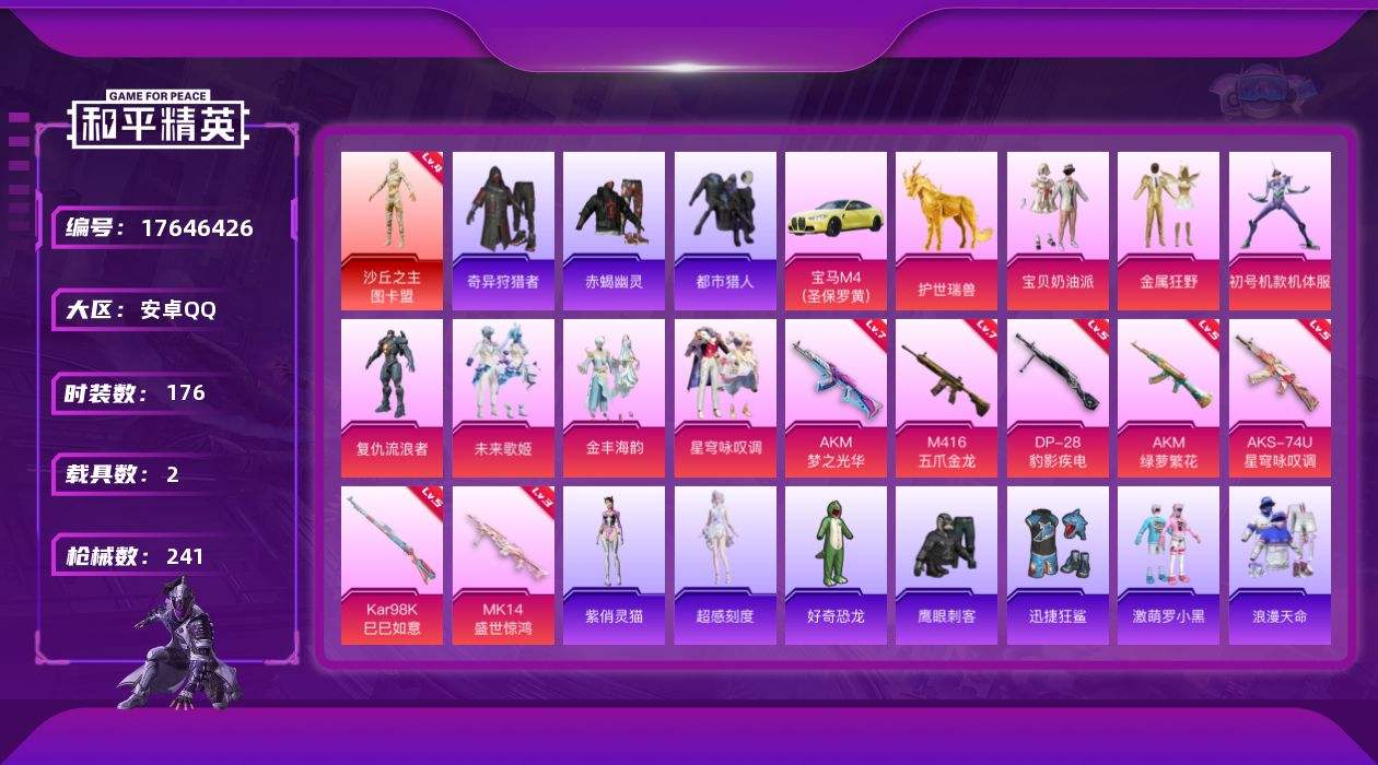 【556862】【不可二次】【安卓QQ】M416-五爪金龙 AKM-梦之光华 奇异狩猎者 宝贝奶油派 金属狂野 紫螳螂