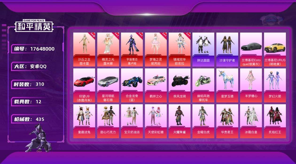 【557006】【可二次】【安卓QQ】合金龙骨蓝色 焰龙焚天 火耀朱雀 M416-五爪金龙 萌兔起飞 SCAR-机甲封神 MG3-洛神天依 甜心巧克力 兰博轿车灰色 M417射手步枪 华贵君王 兰博SUV黄色 银龙傲海 AKM-炫紫旋律 空客蔚蓝之翼 梦幻火箭 暗夜玫瑰 天使彩虹糖 金耀白虎 浪漫波比 宝贝奶油派 沙漠守护者 M24-星之信仰 AKM-甜心宝贝