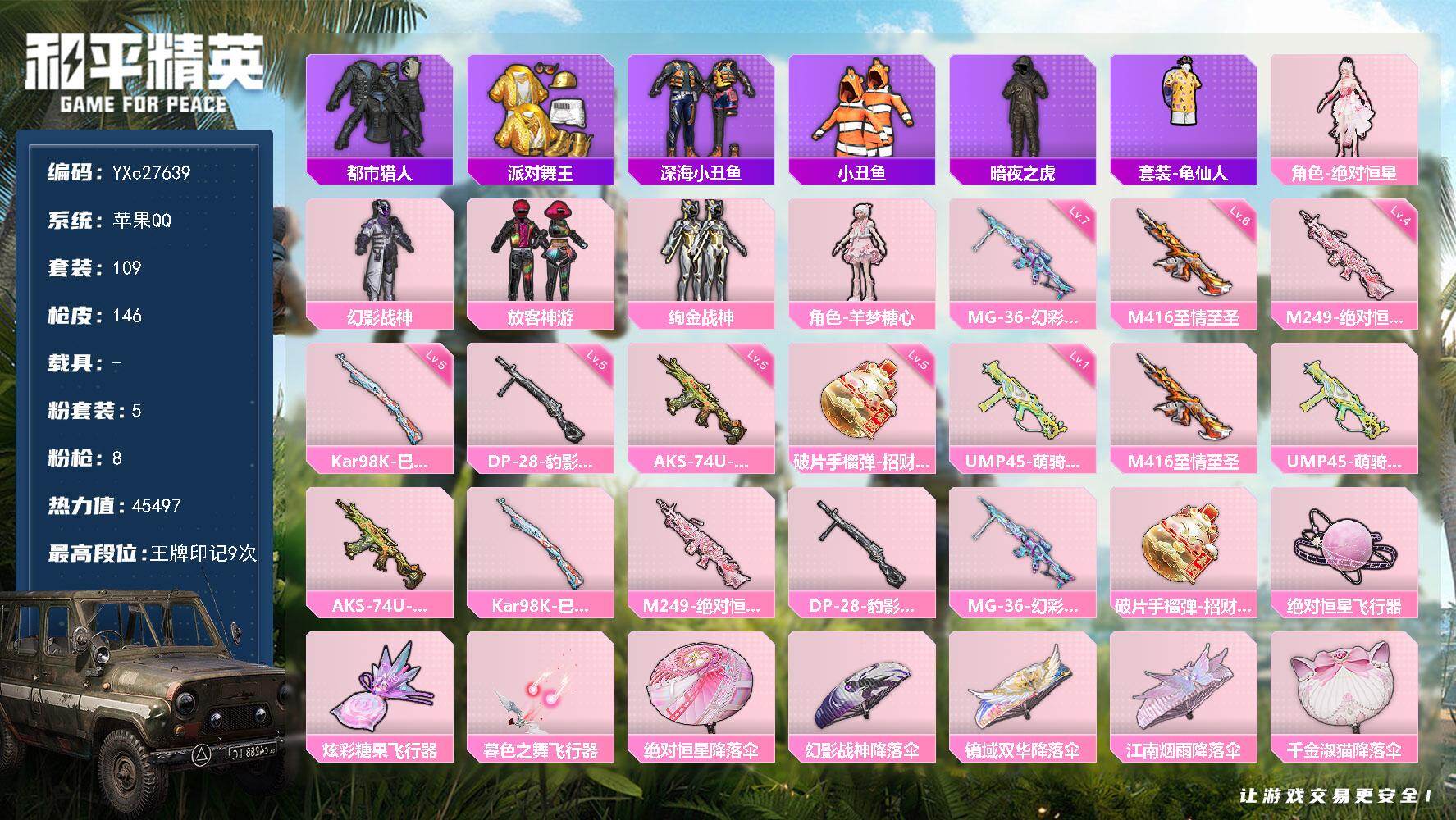 【557074】【不可二次】【苹果QQ】龟仙人 绚金战神 漫步者 都市猎人 幻影战神降落伞 东方飞龙 极速红龙 放客神游 M416-至情至圣 暗夜之虎 AKM-缤纷海域 深海小丑鱼 幻影战神 派对舞王 幻影公爵