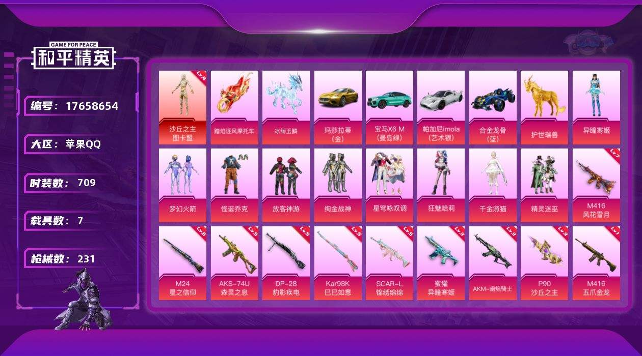 【557959】【不可二次】【苹果QQ】合金龙骨蓝色 龟仙人 M416-五爪金龙 P90-沙丘之主 极速红龙 沙丘之主-图卡盟 放客神游 激萌小黄鸭 浪漫天命 绚金战神 怪诞乔克 精灵迷巫 潮萌小黄鸭 黑色刀锋 龙翔九天飞行器 春暖花开飞行器 SCAR-L-锦绣绵绵 M416-风花雪月 梦幻火箭 AUG-魔法学院 玛莎拉蒂金色 M24-星之信仰 M416-魔法学院 雪山精英 星之信仰飞行翼