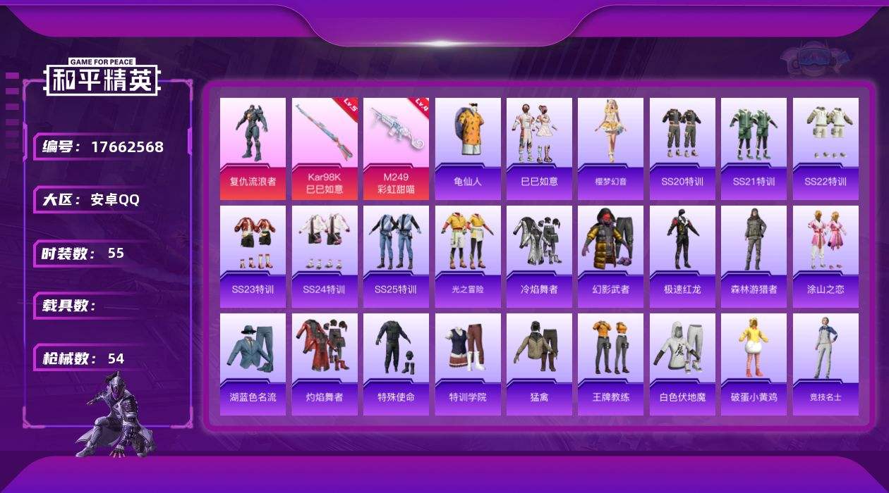 【558993】[17662568]【FK6472】55套装/枪械3/装备51/战备44/热力值16380/五级Kar98K-巳巳如意/四级Mk14-福马献瑞/四级M249-彩虹甜喵/龟仙人/复仇流浪者/Kar98K-巳巳如意/Mk14-福马献瑞/M249彩虹甜喵/星之彼岸降落伞/彩虹甜喵降落伞/炫光之旅降落伞/巳巳如意/樱梦幻音/AKM-彩虹符号/AKM-恐龙拽拽/AKM-龙的传人/SCAR-