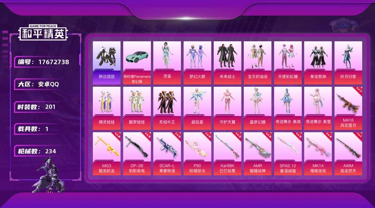 【559993】【可二次】【安卓QQ】精灵娃娃 吟月归客 M416-风花雪月 梦幻火箭 天使彩虹糖 宝贝奶油派 酣梦娃娃 激萌小黄鸭 未来战士 AWM-焰龙焚天 骨龙祭渊 SCAR-L-青春物语