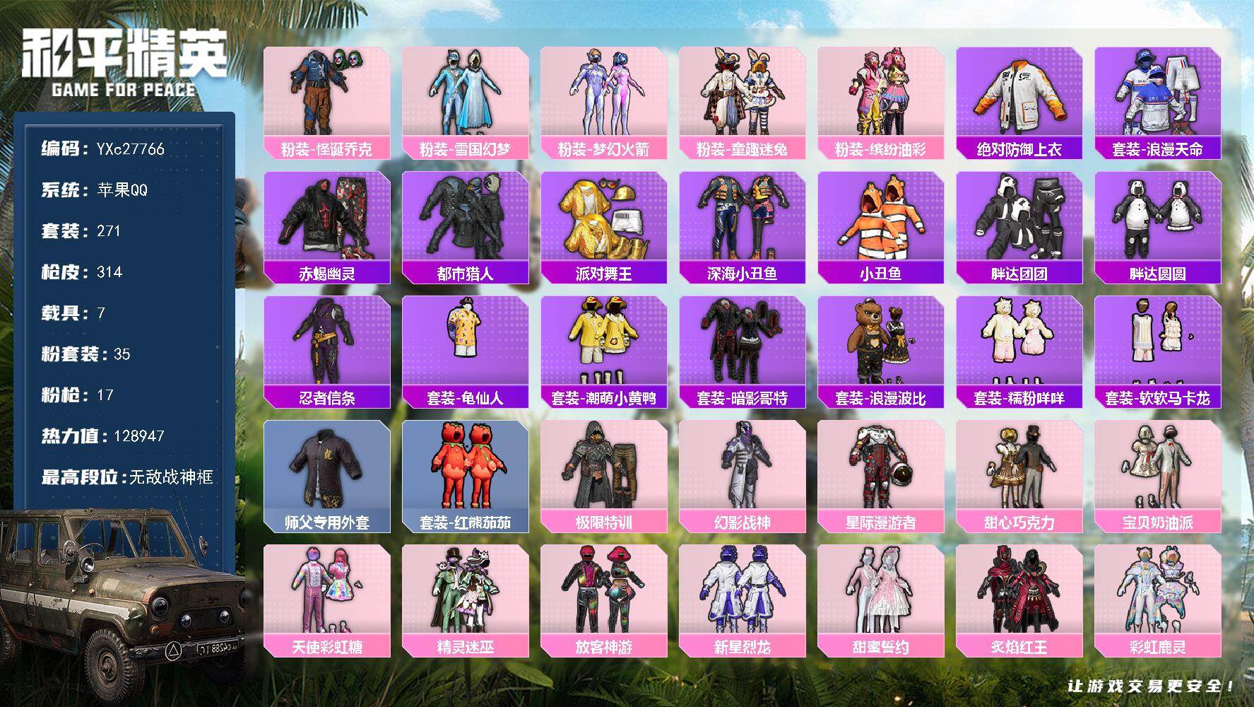 【560355】【可二次】【苹果QQ】星际漫游者降落伞 龟仙人 双人摩托梦幻火箭 水银刺客 极限特训降落伞 大橘为重 漫步者 都市猎人 洛神天依降落伞 暗夜鎏金降落伞 忍者信条 冰川粉黛降落伞 M762-奇异狩猎者 M416-心之恋语 缤纷油彩 深海小丑鱼 浪漫波比 童趣迷兔 纯白誓言 怪诞乔克 迅捷狂鲨 潮萌小黄鸭 音爆索尼克降落伞 AKM-梦之光华 甜蜜誓约 恐龙拽拽降落伞 梦幻火箭降落伞