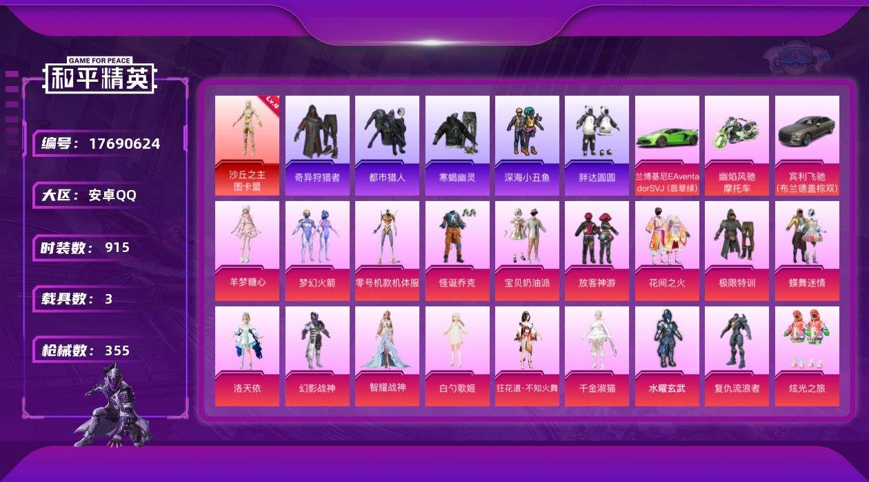 【561615】【不可二次】【安卓QQ】龟仙人 水银刺客 M416-星际漫游 花间之火 都市猎人 忍者信条 寒蝎幽灵 沙丘之主-图卡盟 空客蔚蓝之翼 黄螳螂 深海小丑鱼 山涧鹿灵 蝶舞迷情 SCAR-L-梦幻火箭 兰博SVJ绿色 M24-镜域双华 怪诞乔克 迅捷狂鲨 Vector-环太平洋 龙翔九天飞行器 水耀玄武 AKM-梦之光华 GROZA-精灵之光 UMP45-相思残雪 六号树人 彗云及圣