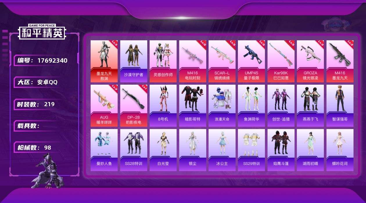 【562207】【可二次】【安卓QQ】M416-电玩时刻 SCAR-L-锦绣绵绵 龟仙人 UMP45-量子极限 墨龙九天-敖渊 沙漠守护者 浪漫天命 龙翔九天飞行器 暗影哥特 M416-墨龙九天