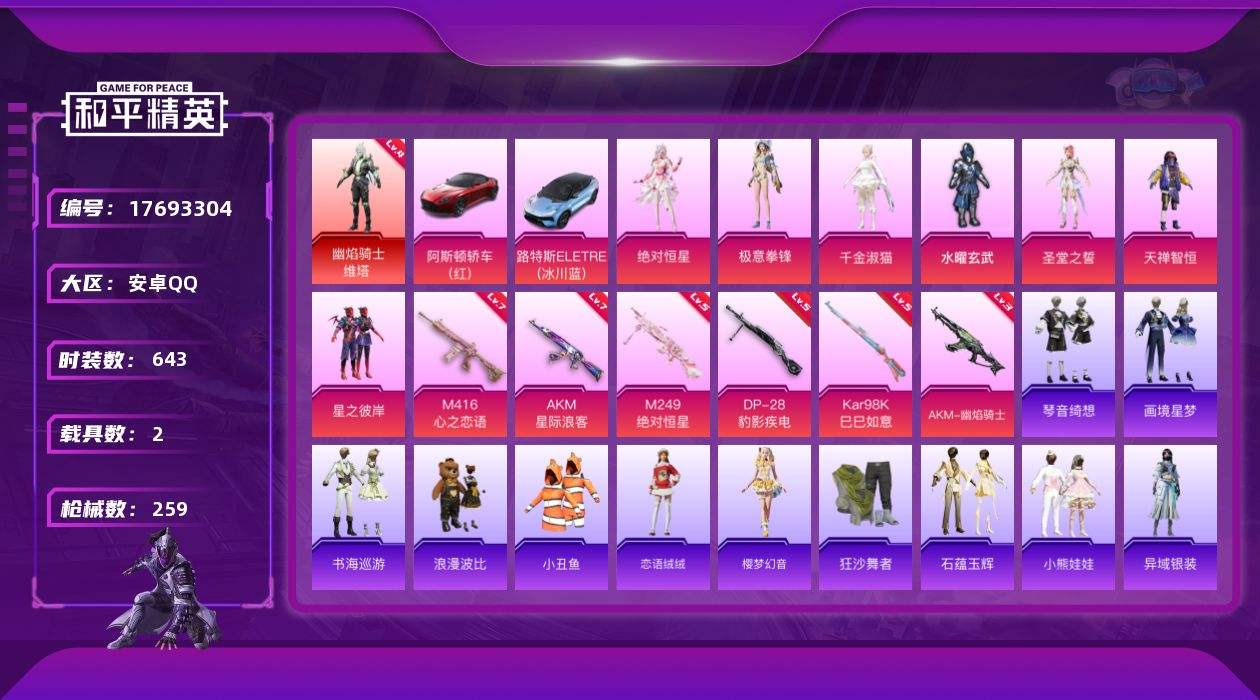 【562368】【不可二次】【安卓QQ】龟仙人 AKM-星际浪客 天禅智恒 水曜玄武 狂沙舞者 幽焰骑士-维塔 水耀玄武 星之彼岸 M416-心之恋语 阿斯顿马丁S红色 AKM-缤纷海域 粉红小猪 浪漫波比 路特斯EL蓝色