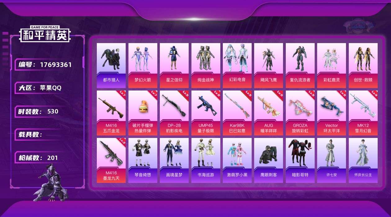 【562384】【不可二次】【苹果QQ】星之信仰 龟仙人 飓风飞鹰 绚金战神 S686-奇异狩猎者 M416-五爪金龙 漫步者 都市猎人 M24-奇异狩猎者 Vector-环太平洋 彩虹鹿灵 忍者信条 M416-墨龙九天 M762-奇异狩猎者 UMP45-量子极限 梦幻火箭 粉红小猪 GROZA-旋转彩虹 暗影哥特 激萌罗小黑 团圆交子 AKM-奇异狩猎者
