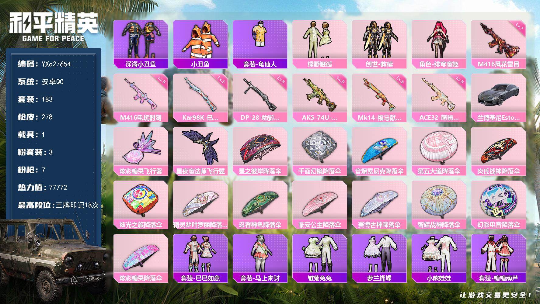 【564098】【可二次】【安卓QQ】龟仙人 迅捷狂鲨 千面幻镜降落伞 M762-瑞龙福将 星之彼岸降落伞 极速红龙 兰博轿车灰色 音爆索尼克降落伞 M416-电玩时刻 第五大道降落伞 M416-风花雪月 AKM-缤纷海域 深海小丑鱼 瑞龙福将 团圆交子