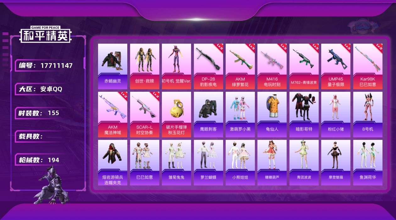 【564544】[17711147]安卓 手Q-2粉装-10特效枪-0载具-2粉色飞行器-61664热力值-11王牌印记-155套装-194枪皮【热门品类】:套装-赤蝎幽灵,套装-龟仙人,套装-暗影哥特,套装-粉红小猪,角色-8号机,熔岩游骑兵连帽夹克【粉色套装】:套装-创世·救赎,角色-初号机 觉醒Ver.【粉色枪皮等级】:AKM-绿萝繁花(五级),AKM-魔法神域(三级),SCAR-L-时空