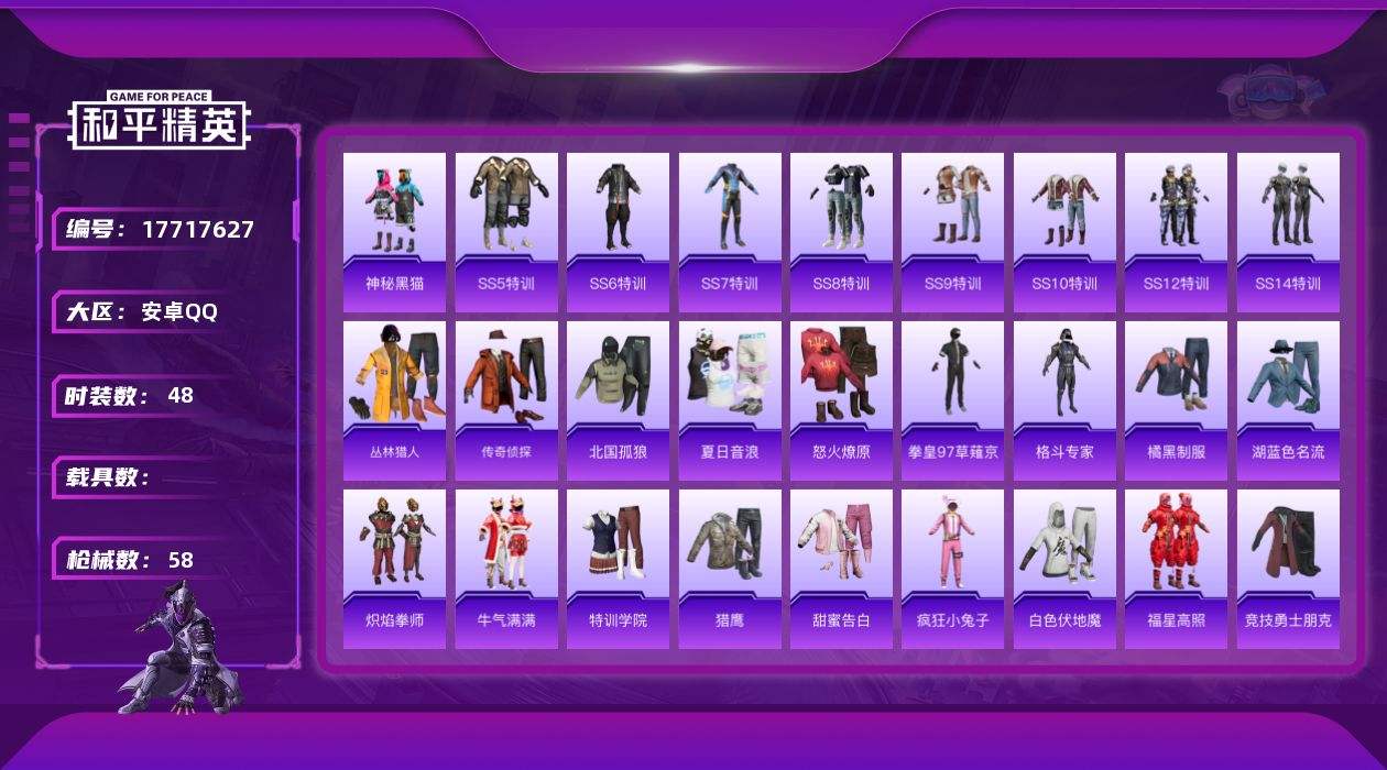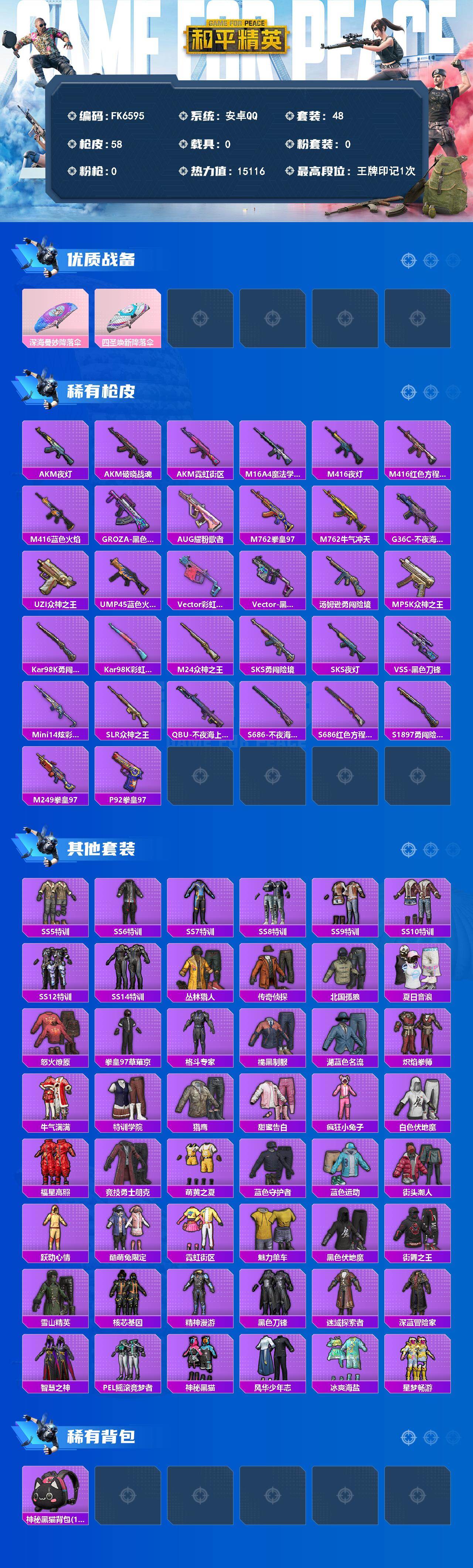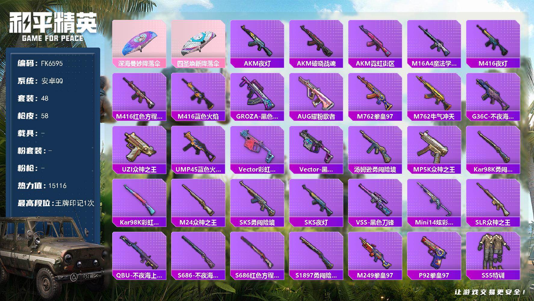 【565290】[17717627]【FK6595】48套装/装备52/战备48/王牌印记1/热力值15116/深海曼妙降落伞/四圣焕新降落伞/AKM-夜灯/AKM-破晓战魂/AKM-霓虹街区/M16A4-魔法学院/M416-夜灯/M416-红色方程式/M416-蓝色火焰/GROZA-黑色刀锋/AUG-耀粉歌者/M762-拳皇97/M762-牛气冲天/G36C-不夜海上花/UZI-众神之王/UM