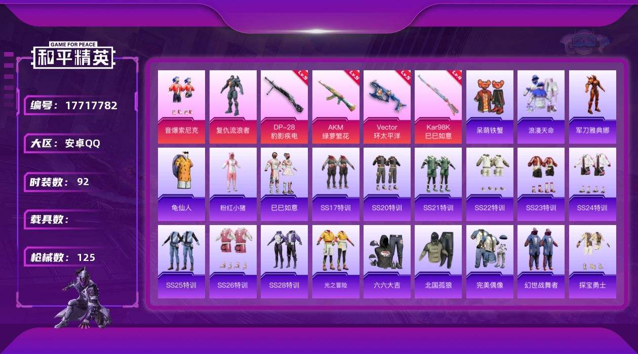 【565315】[17717782]【FK6596】92套装/枪械5/装备125/战备74/王牌印记2/热力值35628/五级AKM-绿萝繁花/五级Vector-环太平洋/四级Kar98K-巳巳如意/三级Mk14-福马献瑞/五级DP-28-豹影疾电/音爆索尼克/浪漫天命/军刀雅典娜/龟仙人/粉红小猪/复仇流浪者/AKM绿萝繁花/Vector环太平洋/Kar98K-巳巳如意/Mk14-福马献瑞/D