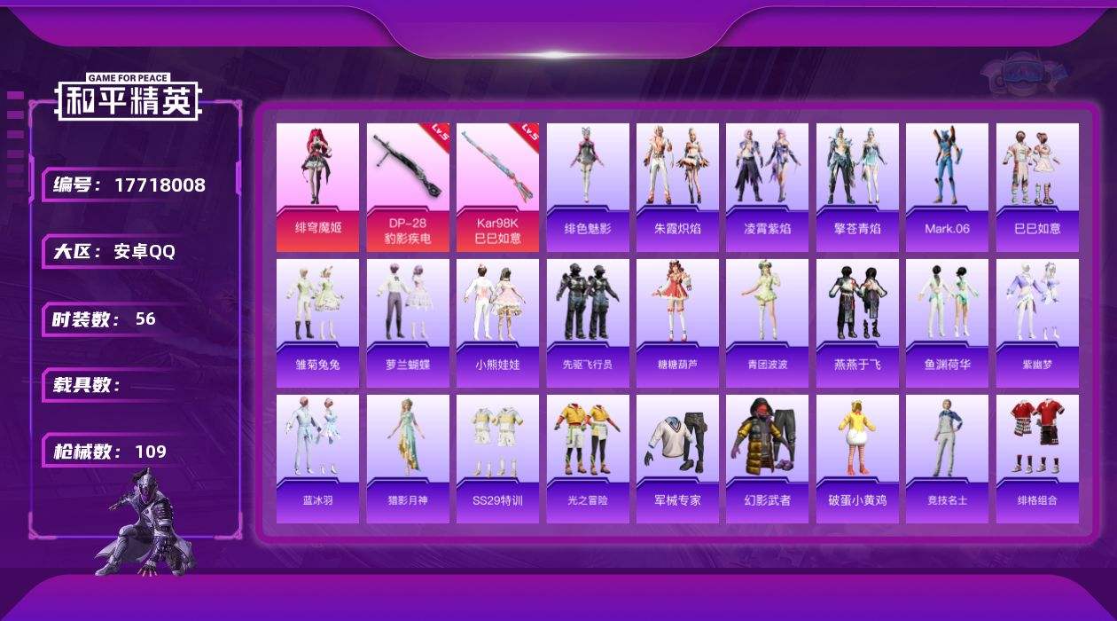 【565362】[17718008]安卓 手Q-1粉装-4特效枪-0载具-1粉色飞行器-28085热力值-6王牌印记-56套装-109枪皮【热门品类】:角色-Mark.06【粉色套装】:角色-绯穹魔姬【粉色枪皮等级】:UMP45-萌骑冒险(三级),Kar98K-巳巳如意(五级),Mk14-福马献瑞(五级),DP-28-豹影疾电(五级)【粉色枪皮】:UMP45-萌骑冒险,Kar98K-巳巳如意,M