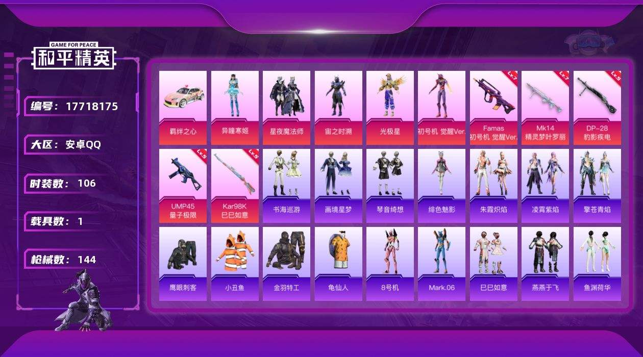 【565381】[17718175]安卓 手Q-5粉装-8特效枪-1载具-3粉色飞行器-44833热力值-4王牌印记-106套装-144枪皮【热门品类】:套装-小丑鱼,套装-金羽特工,套装-龟仙人,角色-8号机,角色-Mark.06【粉色套装】:粉装-星夜魔法师,角色-宙之时溯,角色-光极星,角色-初号机 觉醒Ver.,角色-异瞳寒姬【粉色枪皮等级】:Famas-初号机 觉醒Ver.(七级),A