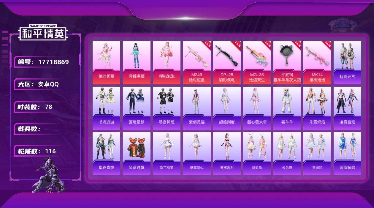 【565497】[17718869]安卓 手Q-3粉装-7特效枪-0载具-2粉色飞行器-34880热力值-5王牌印记-78套装-116枪皮【粉色套装】:角色-绝对恒星,角色-樱桃泡泡,角色-异瞳寒姬【粉色枪皮等级】:Mk14-樱桃泡泡(五级),Mk14-福马献瑞(五级),AA12-G-萌骑幻想(三级),M249-绝对恒星(五级),DP-28-豹影疾电(五级),MG-36-沧焰双生(五级),平底锅