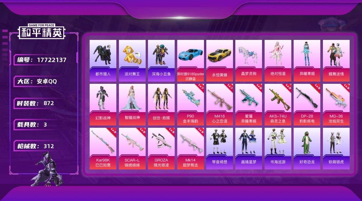 【566223】【可二次】【安卓QQ】软萌银虎 龟仙人 P90-金丰海韵 漫步者 都市猎人 M762-瑞龙福将 极速红龙 SCAR-L-锦绣绵绵 暗夜之虎 M416-心之恋语 永恒黄蜂 粉红小猪 深海小丑鱼 幻影战神 瑞龙福将 派对舞王 蝶舞迷情 AWM-黄金龙骨 团圆交子