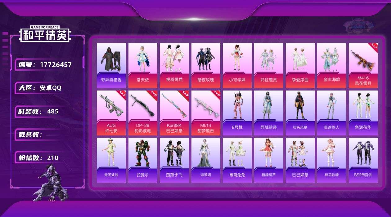 【567015】【不可二次】【安卓QQ】Mini14-林间仙鹿 M416-风花雪月 暗夜玫瑰 MK47-林间仙鹿 暗夜契约 奇异狩猎者 洛天依 极速红龙 彩虹鹿灵 纯白誓言