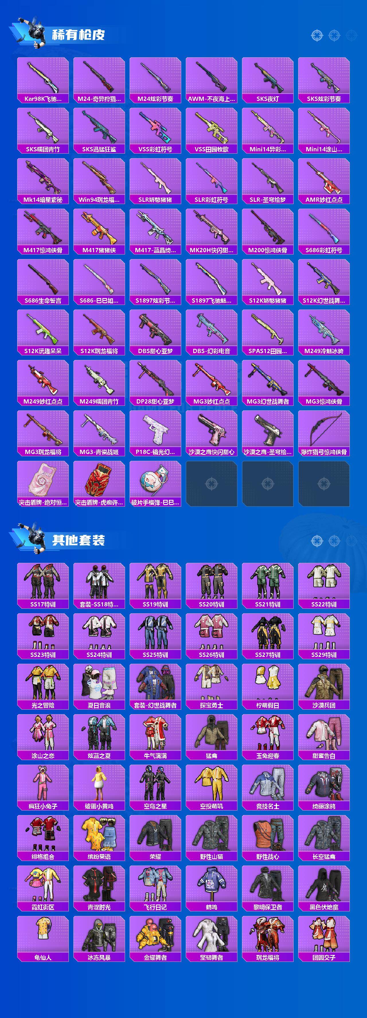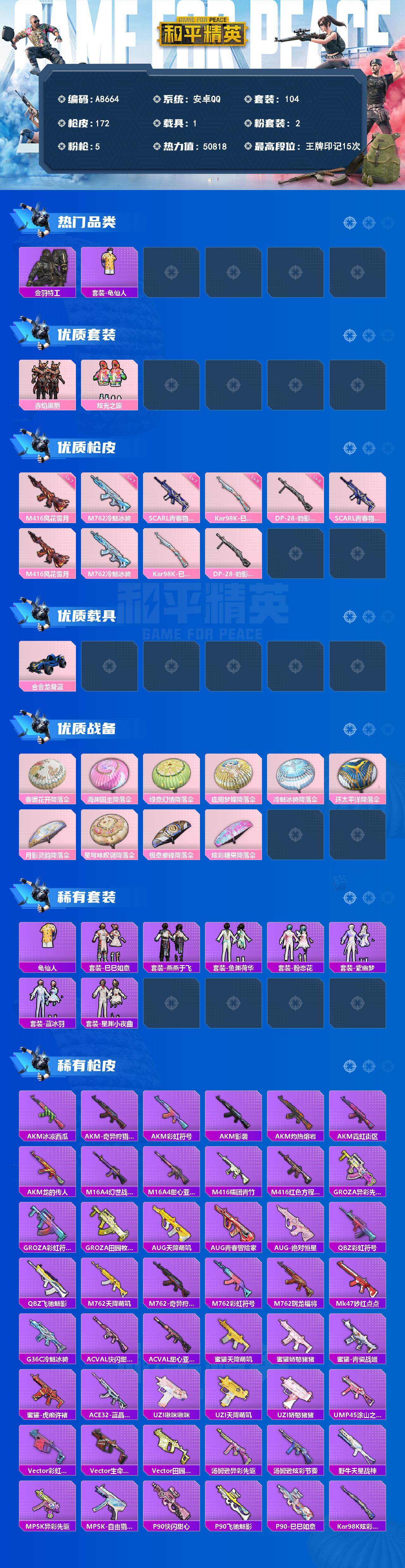【568294】【可二次】【安卓QQ】合金龙骨蓝色 龟仙人 春暖花开降落伞 M24-奇异狩猎者 M762-瑞龙福将 金羽特工 M762-奇异狩猎者 赤焰黑爵 M416-风花雪月 海渊国主降落伞 庄周梦蝶降落伞 瑞龙福将 环太平洋降落伞 SCAR-L-青春物语 团圆交子 AKM-奇异狩猎者