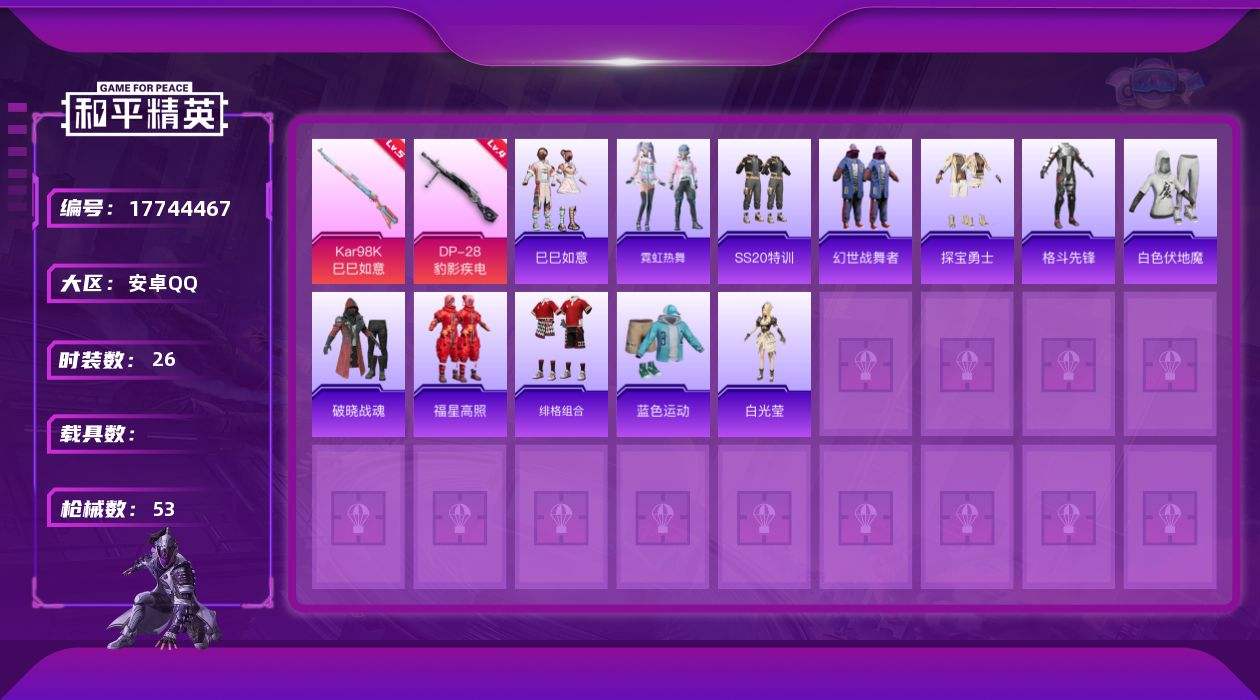 【569127】[17744467]【FK6442】26套装/枪械4/装备39/战备35/热力值11807/三级ACE32-萌骑漫游/五级Kar98K-巳巳如意/五级Mk14-福马献瑞/四级DP-28-豹影疾电/ACE32-萌骑漫游/Kar98K-巳巳如意/Mk14-福马献瑞/DP-28-豹影疾电/忍者神龟降落伞/未来领航者降落伞/樱桃泡泡降落伞/异瞳寒姬降落伞/虎痴许褚降落伞/巳巳如意/套装-