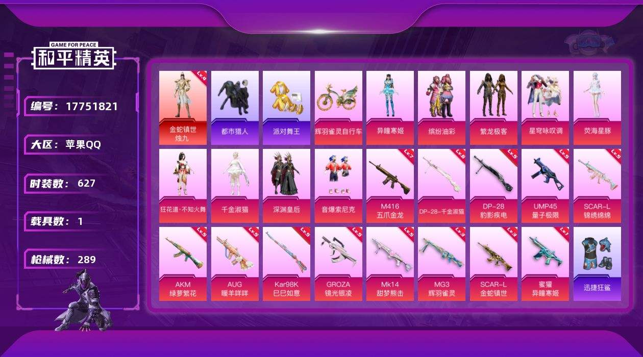 【570173】【不可二次】【苹果QQ】龟仙人 AKM-绿萝繁花 深渊皇后 M416-五爪金龙 漫步者 都市猎人 迅捷狂鲨 金蛇镇世-烛九 狂沙舞者 音爆索尼克 SCAR-L-锦绣绵绵 繁龙极客 UMP45-量子极限 缤纷油彩 浪漫假日 派对舞王 M416-黄金龙骨 浪漫天命 AWM-黄金龙骨 镜光幻境飞行翼 纯白誓言