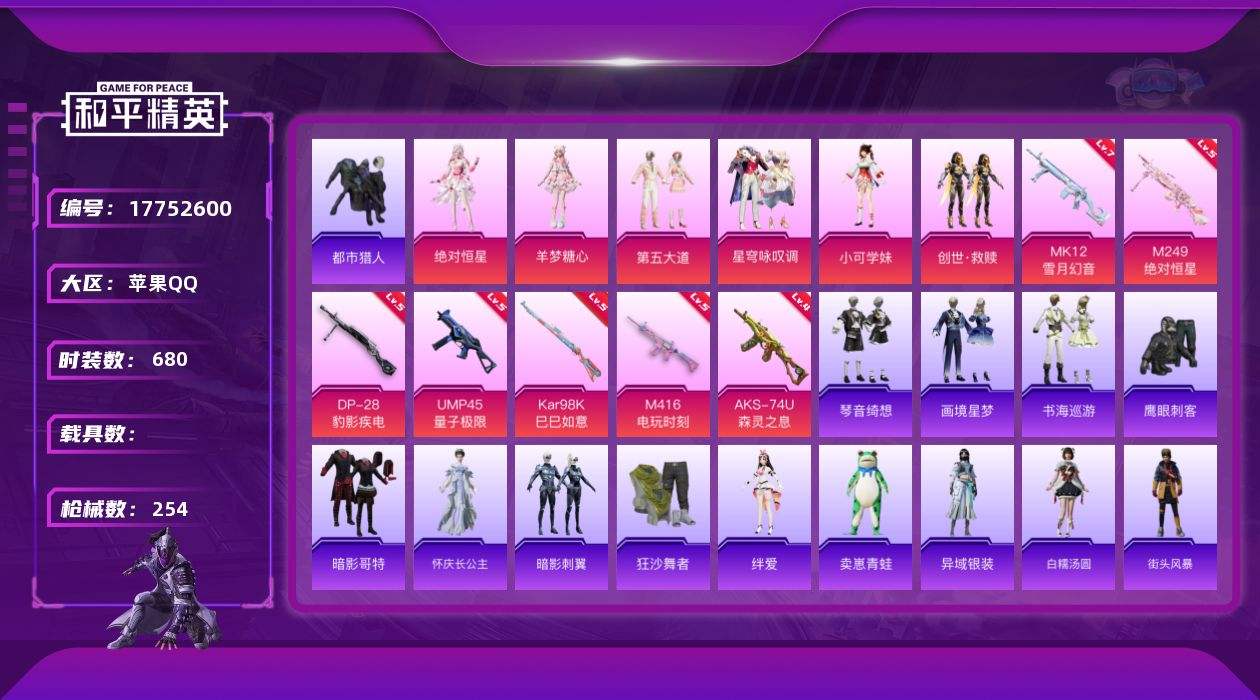 【570510】【不可二次】【苹果QQ】M416-电玩时刻 龟仙人 UMP45-量子极限 漫步者 都市猎人 AKM-缤纷海域 齐天大圣飞行器 粉红小猪 狂沙舞者 极速红龙 萌物绒绒飞行器 暗影哥特