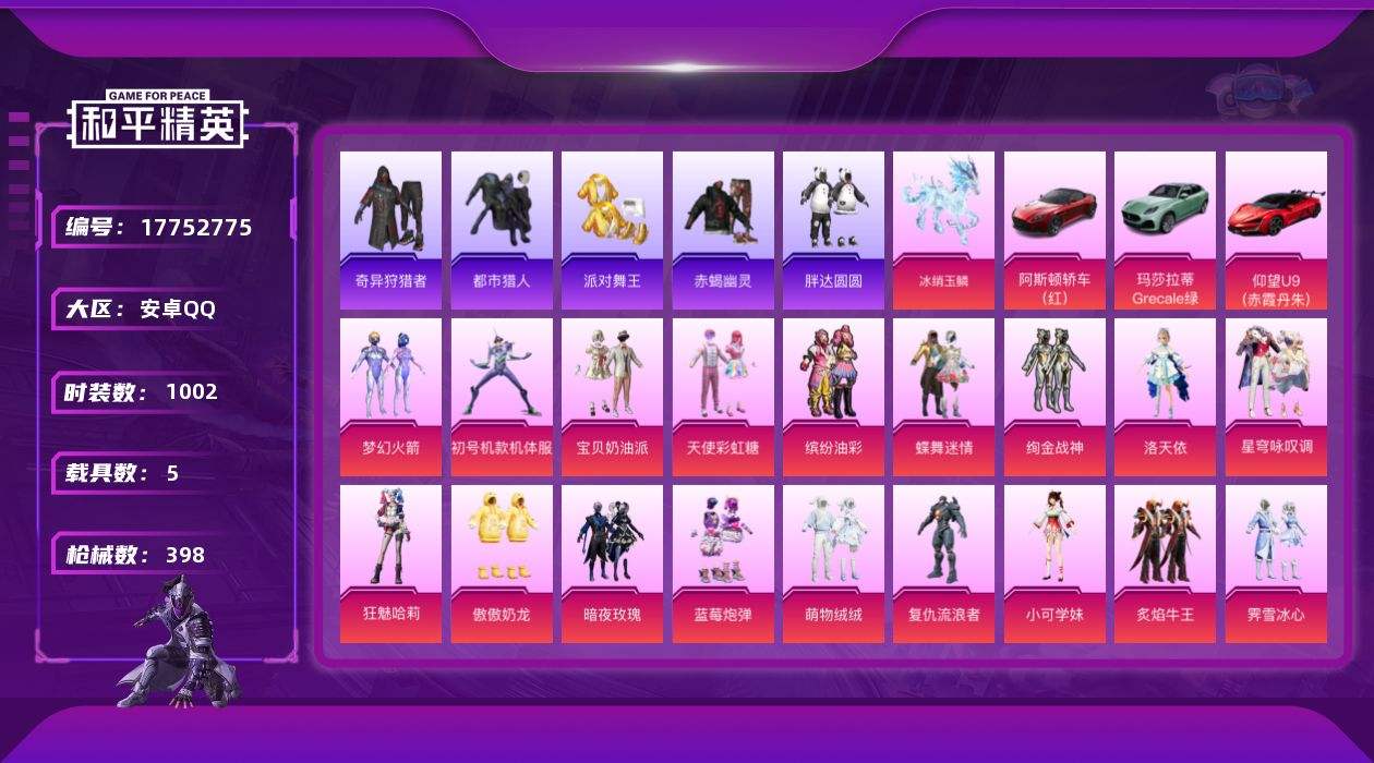 【570567】【不可二次】【安卓QQ】龟仙人 漫步者 都市猎人 苍蓝魅影 娴静芝兰 M416-心之恋语 缤纷油彩 蝶舞迷情 醒狮腾龙 迅捷狂鲨 M762-瑞龙福将 Vector-环太平洋 暗夜玫瑰 AKM-梦之光华 SLR-暗夜玫瑰 蓝莓炮弹 M16A4-垂柳戏鸭 M24-莲影清波 S686-奇异狩猎者 萌兔起飞 洛天依 仰望U9(赤霞丹朱) 汤姆逊-林间仙鹿 赤蝎幽灵 星之彼岸 瑞龙福将 抹