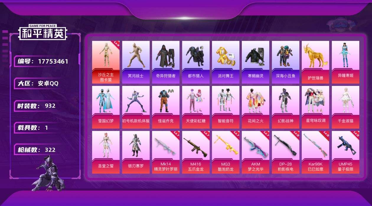 【570743】【不可二次】【安卓QQ】龟仙人 MK14-精灵梦叶罗丽 木乃伊 水银刺客 雪国梦幻 M416-五爪金龙 漫步者 P90-沙丘之主 花间之火 都市猎人 M24-奇异狩猎者 忍者信条 寒蝎幽灵 沙丘之主-图卡盟 UMP45-量子极限 银刃赛罗 深海小丑鱼 瑞龙福将 智能音符 M416-黄金龙骨 浪漫天命 AWM-黄金龙骨 激萌罗小黑 纯白誓言 团圆交子 AKM-奇异狩猎者 怪诞乔克