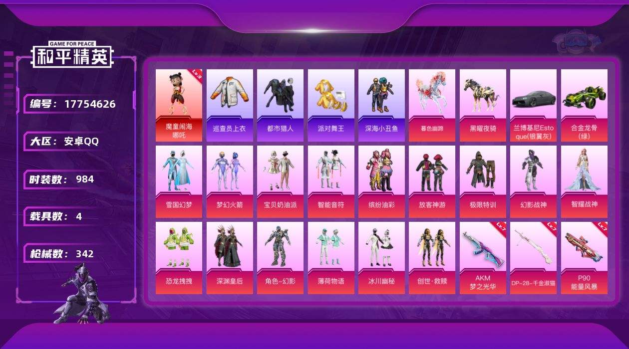 【570998】【不可二次】【安卓QQ】龟仙人 恐龙拽拽 雪国梦幻 深渊皇后 M416-五爪金龙 漫步者 都市猎人 极限特训 忍者信条 放客神游 巡查衣 缤纷油彩 深海小丑鱼 魔童闹海-哪吒 瑞龙福将 智能音符 浪漫天命 激萌罗小黑 团圆交子 P90-能量风暴 合金龙骨绿色 暗夜契约 M762-瑞龙福将 齐天大圣飞行器 MG3-洛神天依 兰博轿车灰色 狂沙舞者 雪国幻梦 梦幻火箭 AKM-梦之光