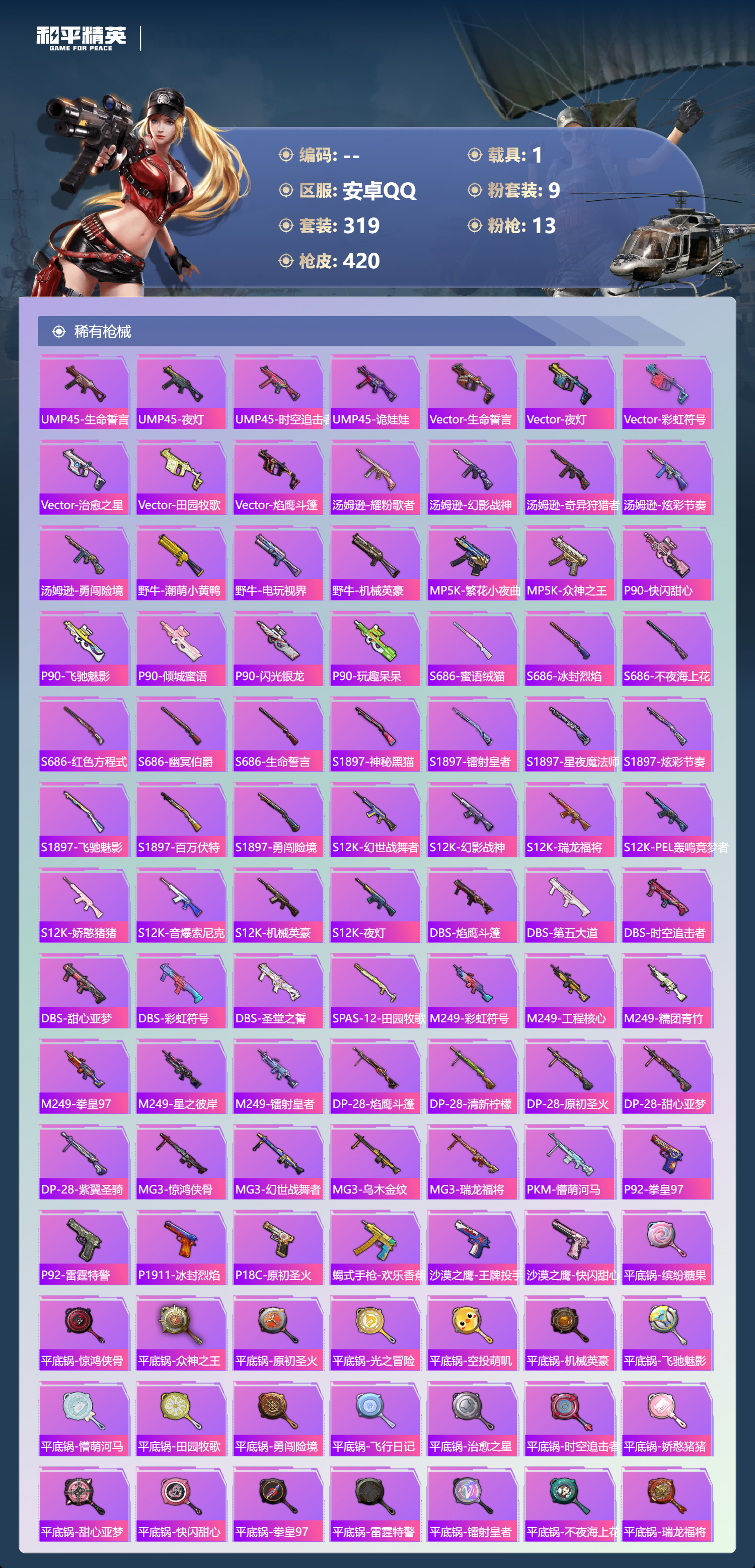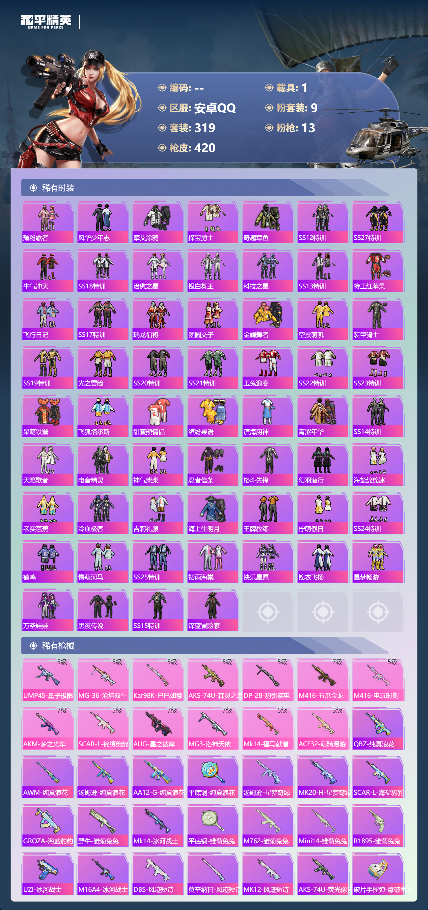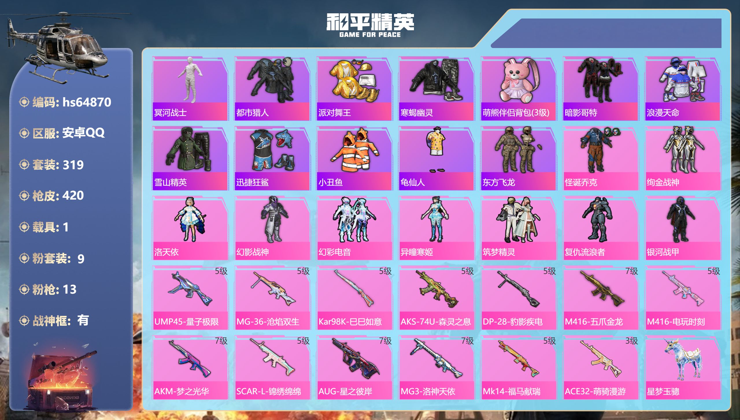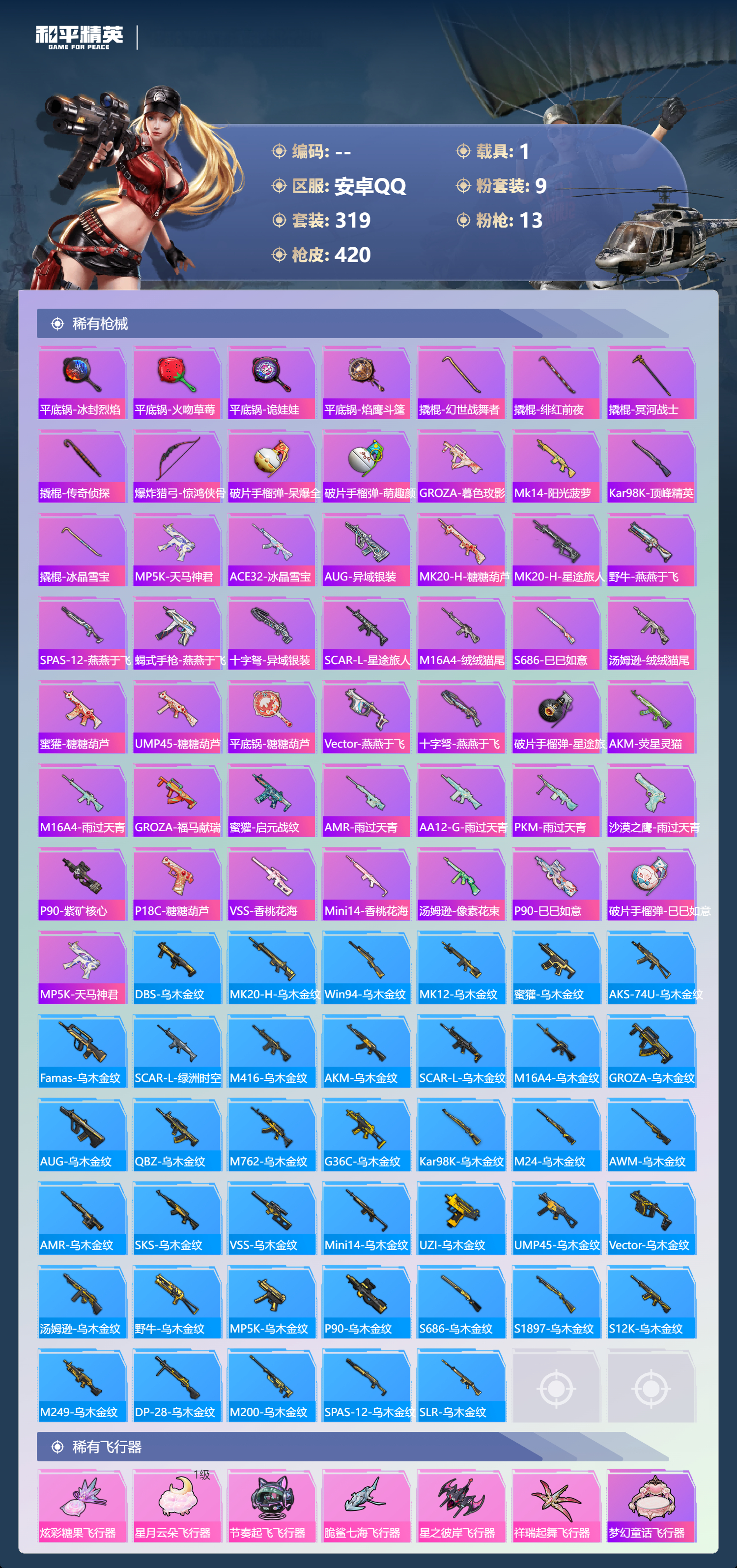 【571509】【可二次】【安卓QQ】龟仙人 木乃伊 M416-五爪金龙 漫步者 都市猎人 东方飞龙 机械英豪 洛天依 星之彼岸飞行器 银河战甲 极速红龙 忍者信条 M762-奇异狩猎者 M416-电玩时刻 寒蝎幽灵 巡查衣 UMP45-量子极限 瑞龙福将 激萌小黄鸭 AUG-星之彼岸 醒狮腾龙 浪漫天命 团圆交子 星梦玉骢 绚金战神 怪诞乔克 迅捷狂鲨 M762-瑞龙福将 潮萌小黄鸭 黑色刀锋