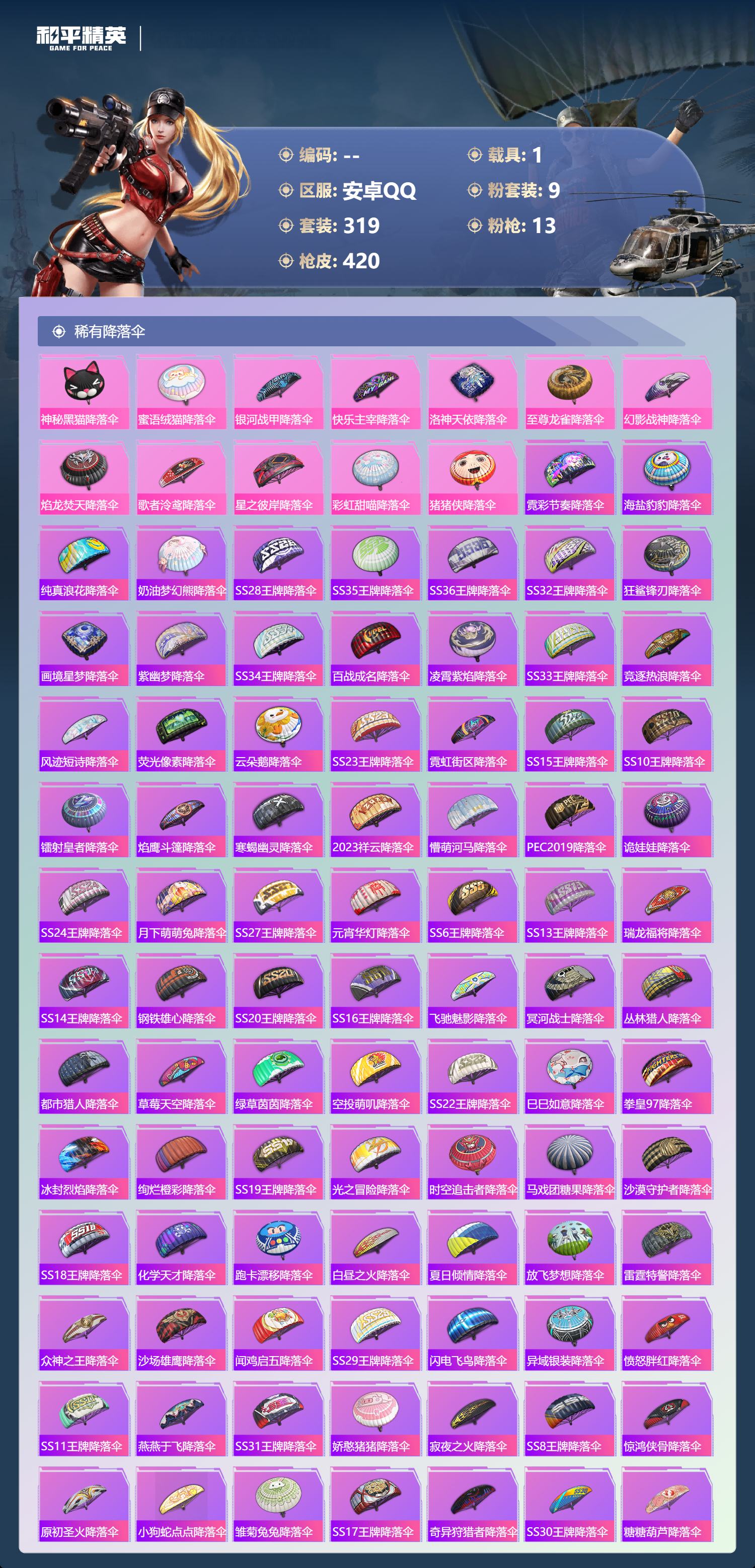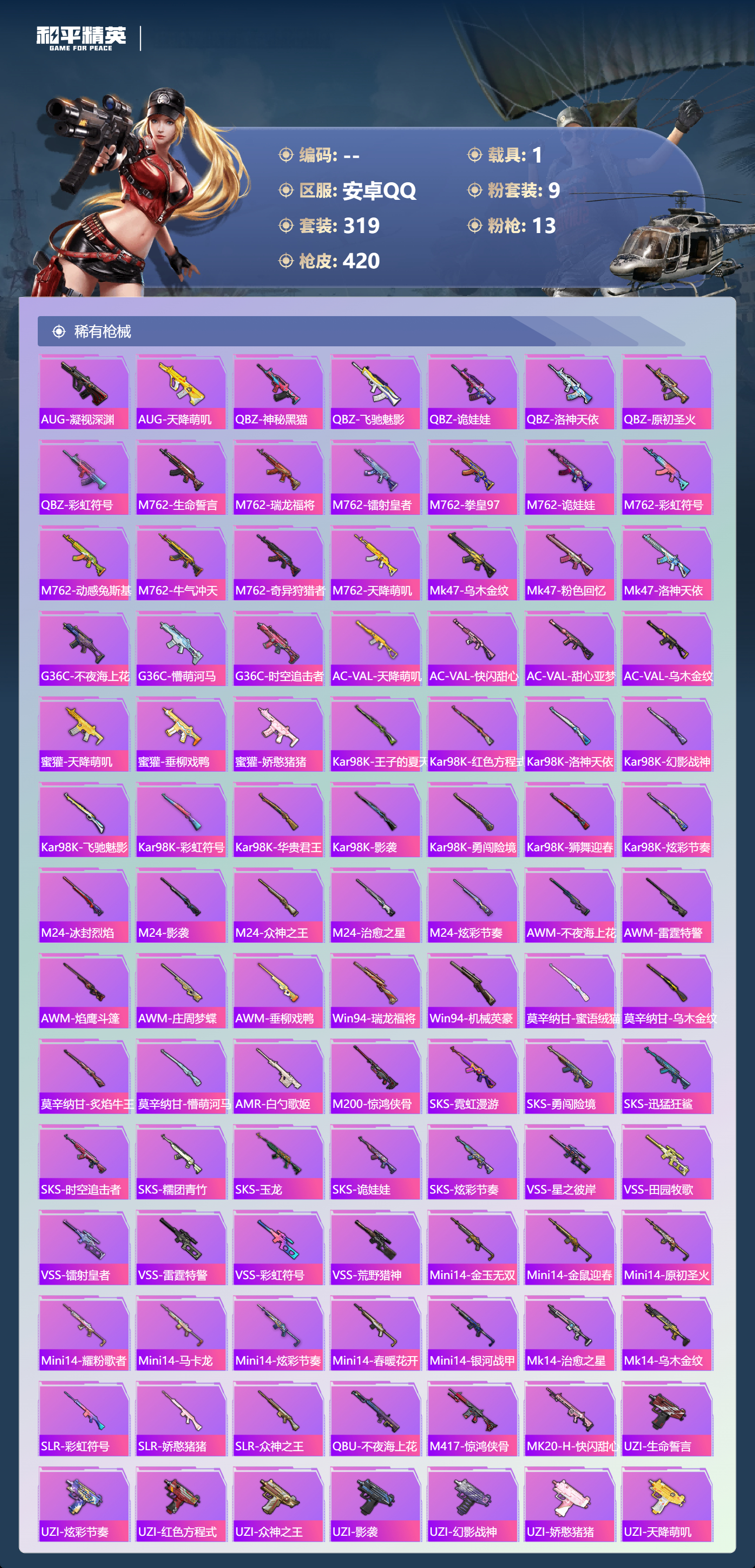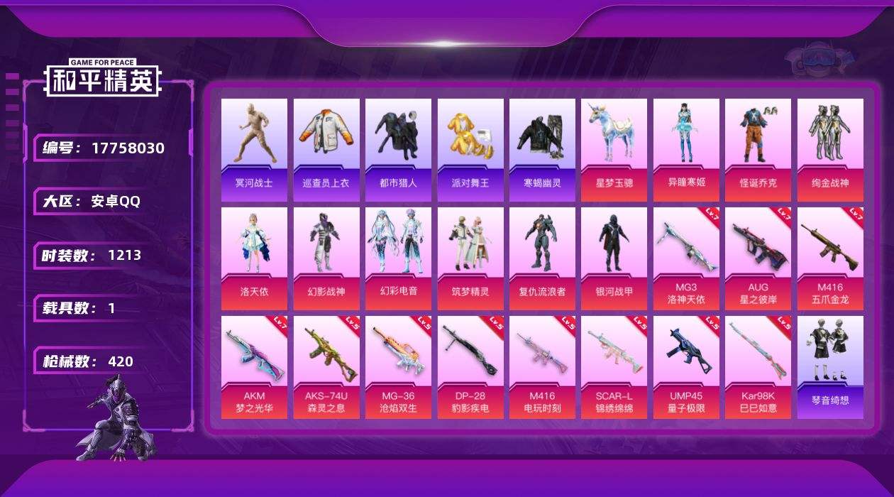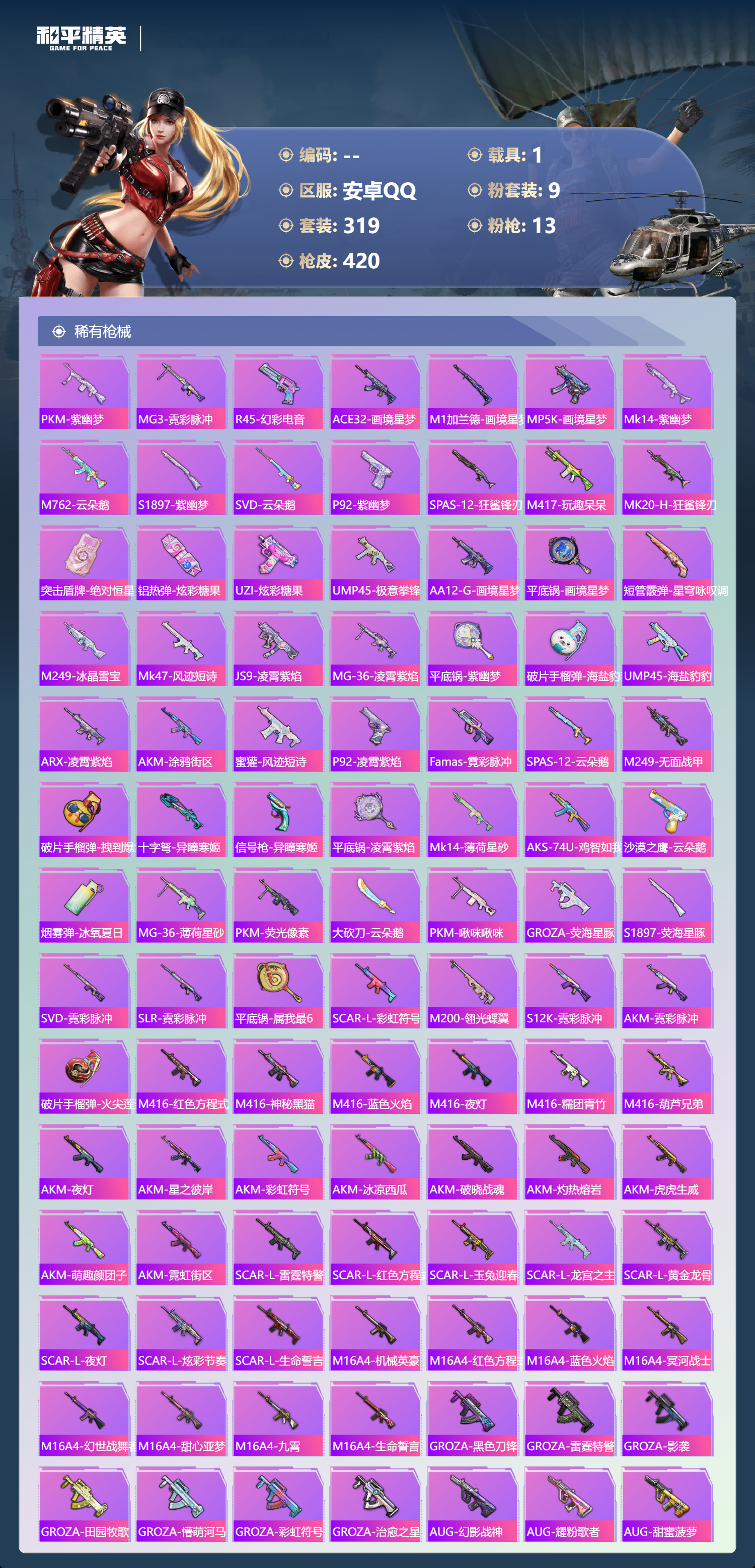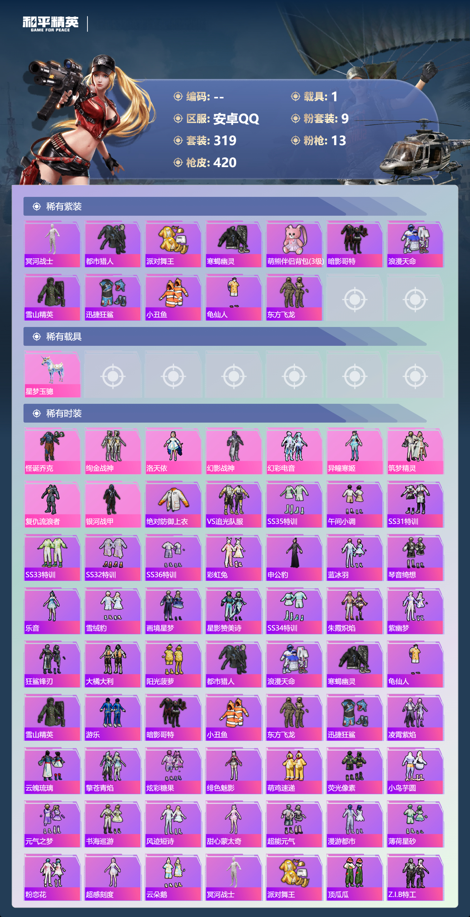 【571509】【可二次】【安卓QQ】龟仙人 木乃伊 M416-五爪金龙 漫步者 都市猎人 东方飞龙 机械英豪 洛天依 星之彼岸飞行器 银河战甲 极速红龙 忍者信条 M762-奇异狩猎者 M416-电玩时刻 寒蝎幽灵 巡查衣 UMP45-量子极限 瑞龙福将 激萌小黄鸭 AUG-星之彼岸 醒狮腾龙 浪漫天命 团圆交子 星梦玉骢 绚金战神 怪诞乔克 迅捷狂鲨 M762-瑞龙福将 潮萌小黄鸭 黑色刀锋