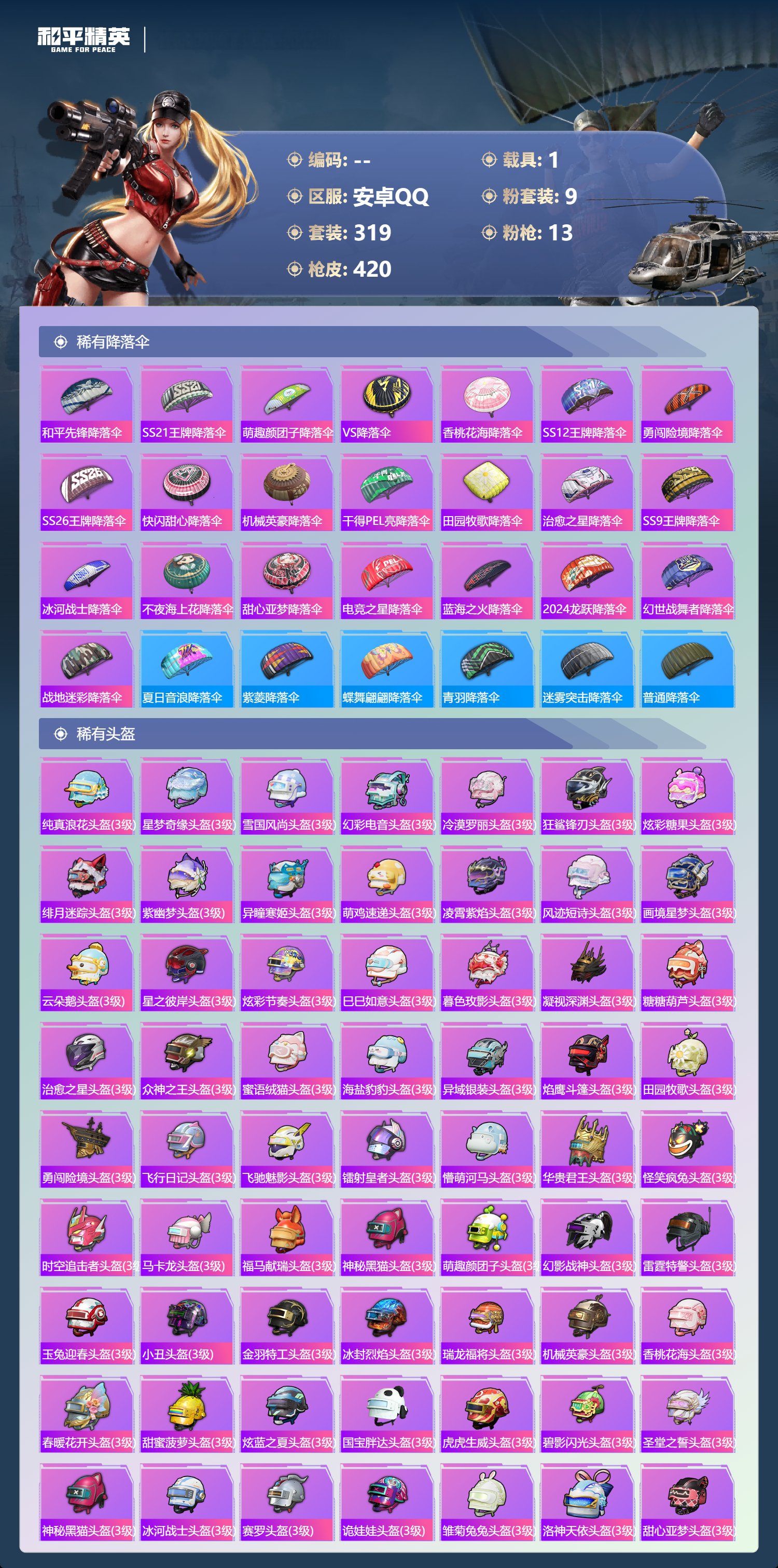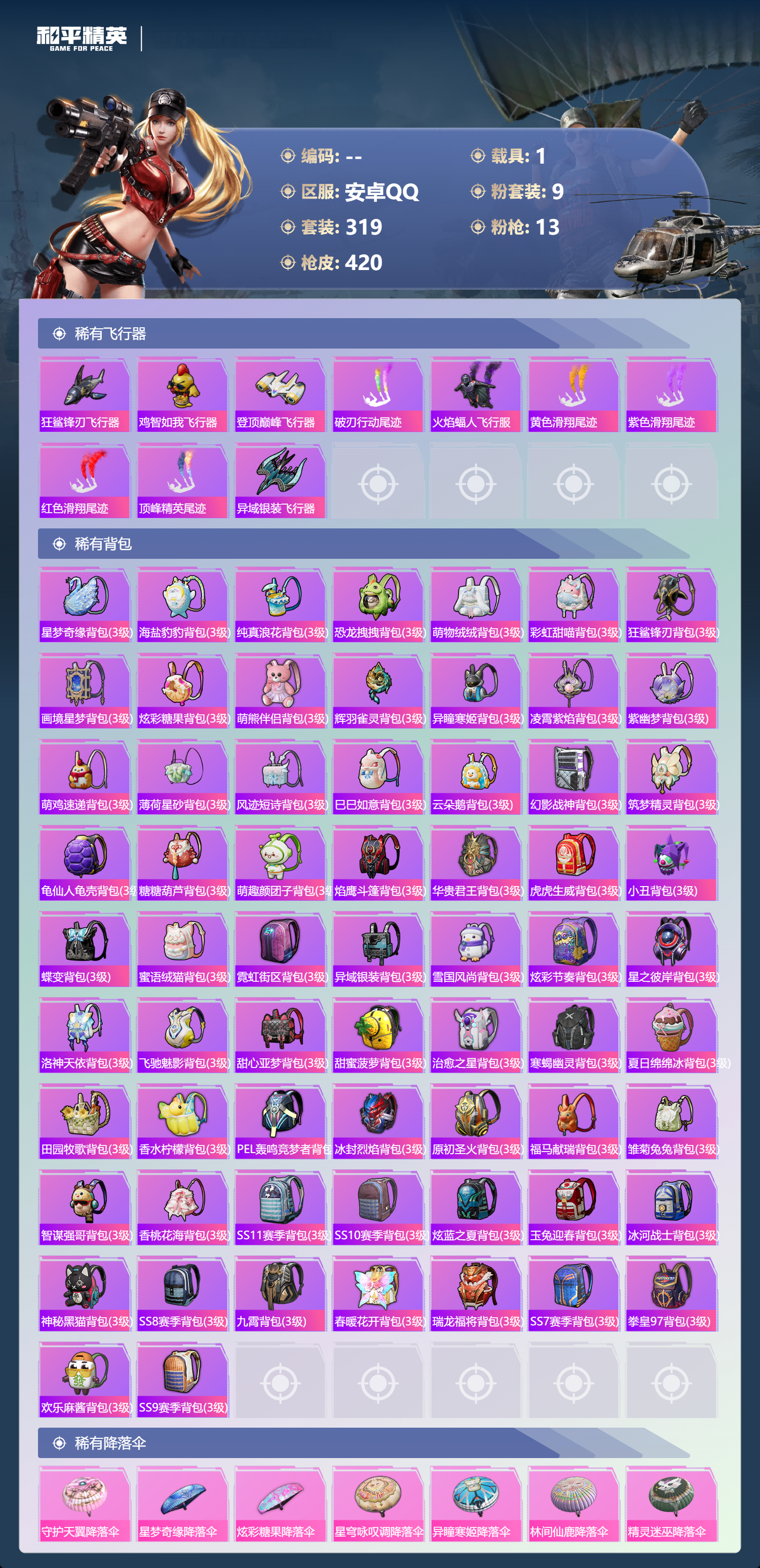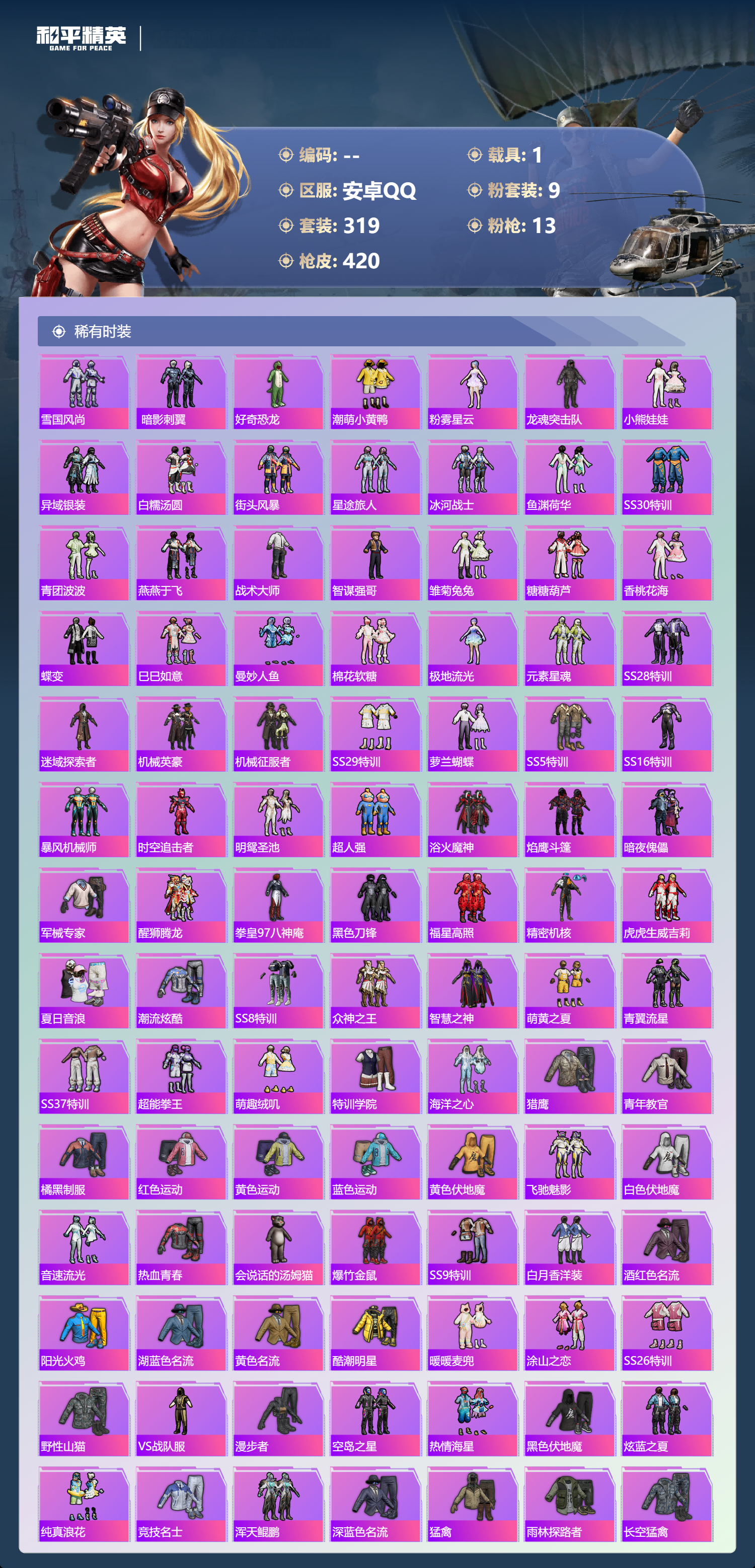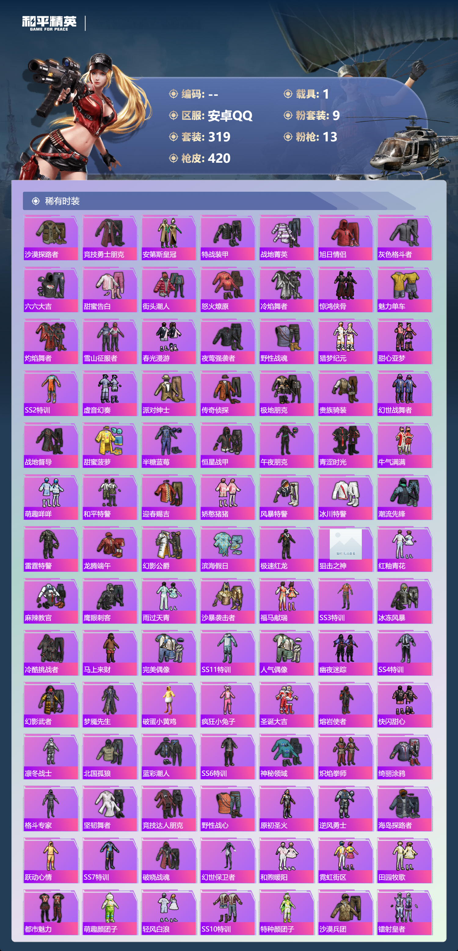 【571509】【可二次】【安卓QQ】龟仙人 木乃伊 M416-五爪金龙 漫步者 都市猎人 东方飞龙 机械英豪 洛天依 星之彼岸飞行器 银河战甲 极速红龙 忍者信条 M762-奇异狩猎者 M416-电玩时刻 寒蝎幽灵 巡查衣 UMP45-量子极限 瑞龙福将 激萌小黄鸭 AUG-星之彼岸 醒狮腾龙 浪漫天命 团圆交子 星梦玉骢 绚金战神 怪诞乔克 迅捷狂鲨 M762-瑞龙福将 潮萌小黄鸭 黑色刀锋