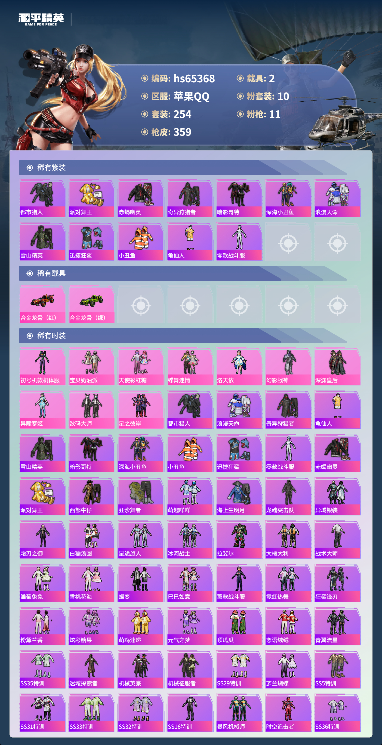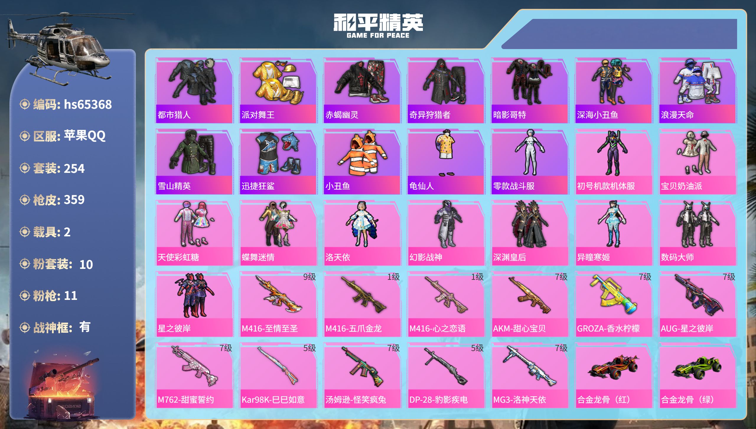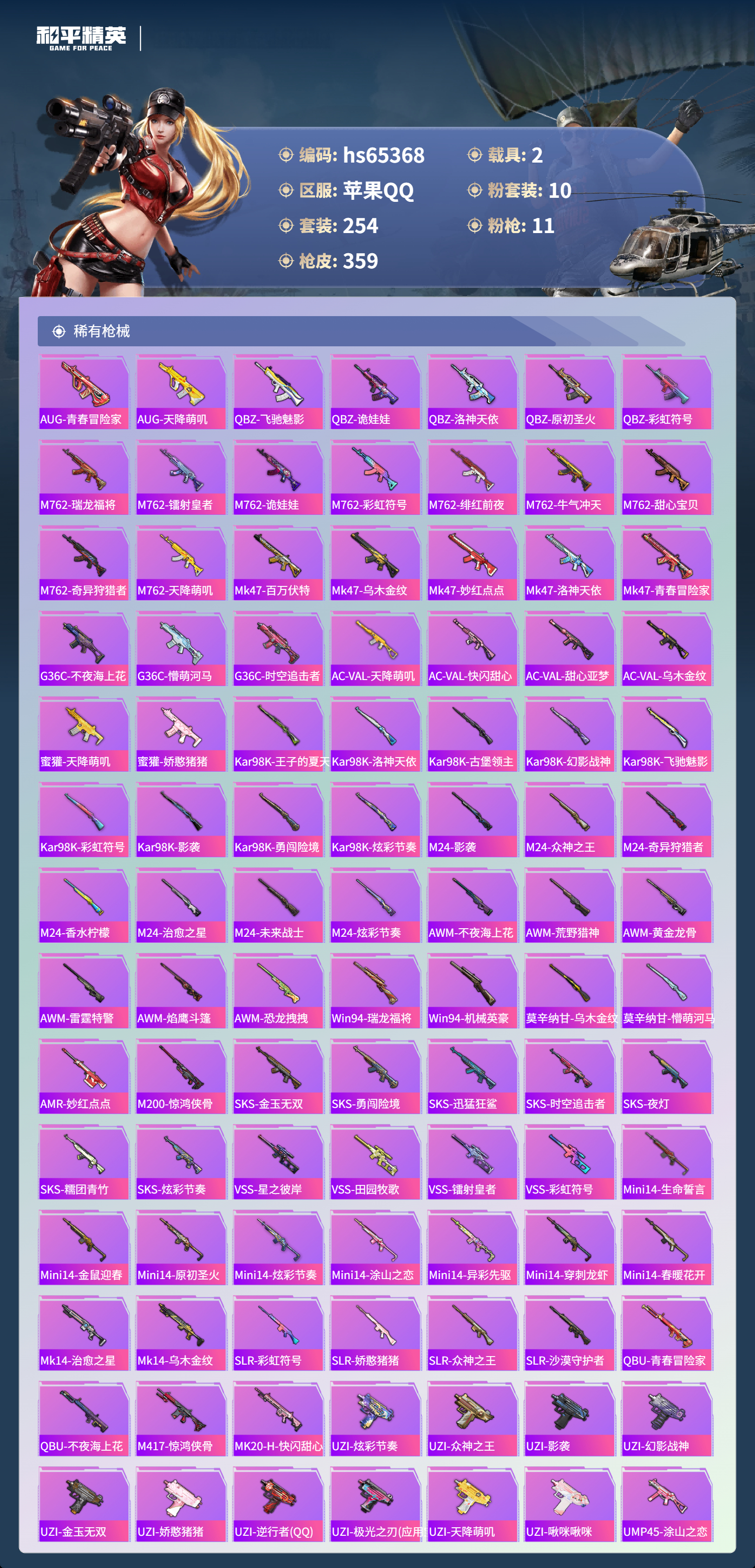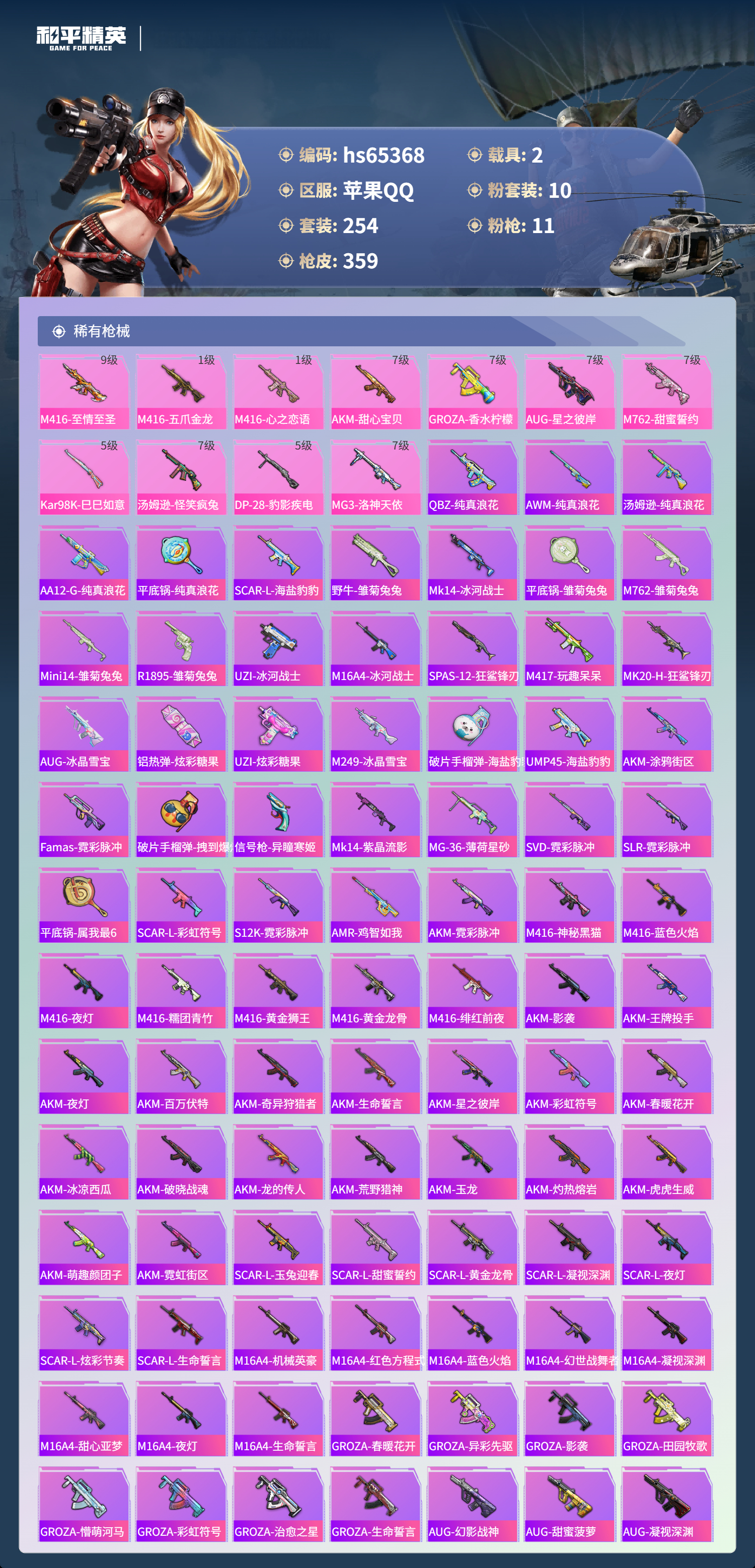 【572101】【可二次】【苹果QQ】M762-甜蜜誓约 龟仙人 水银刺客 漫步者 都市猎人 M762-奇异狩猎者 M416-至情至圣 M416-心之恋语 深海小丑鱼 蝶舞迷情 AUG-星之彼岸 AWM-黄金龙骨 AKM-甜心宝贝 纯白誓言 AKM-奇异狩猎者 合金龙骨红色 迅捷狂鲨 M762-瑞龙福将 狂沙舞者 白月香洋装 汤姆逊-怪笑疯兔 S686-奇异狩猎者 深渊皇后 M416-五爪金龙
