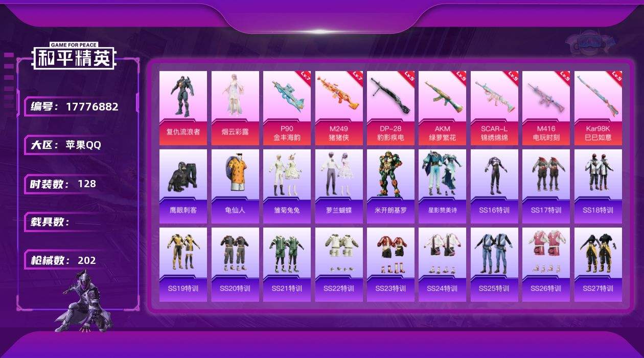 【573970】[17776882]苹果 手Q-2粉装-8特效枪-0载具-2粉色飞行器-59439热力值-14王牌印记-128套装-202枪皮【热门品类】:绝对防御上衣,套装-龟仙人【粉色套装】:角色-复仇流浪者,角色-烟云彩露【粉色枪皮等级】:AKM-绿萝繁花(五级),SCAR-L-锦绣绵绵(五级),M416-电玩时刻(五级),P90-金丰海韵(七级),Kar98K-巳巳如意(五级),Mk14
