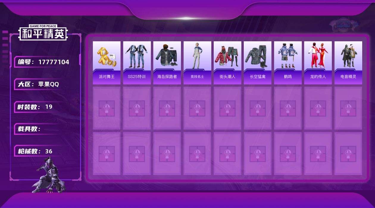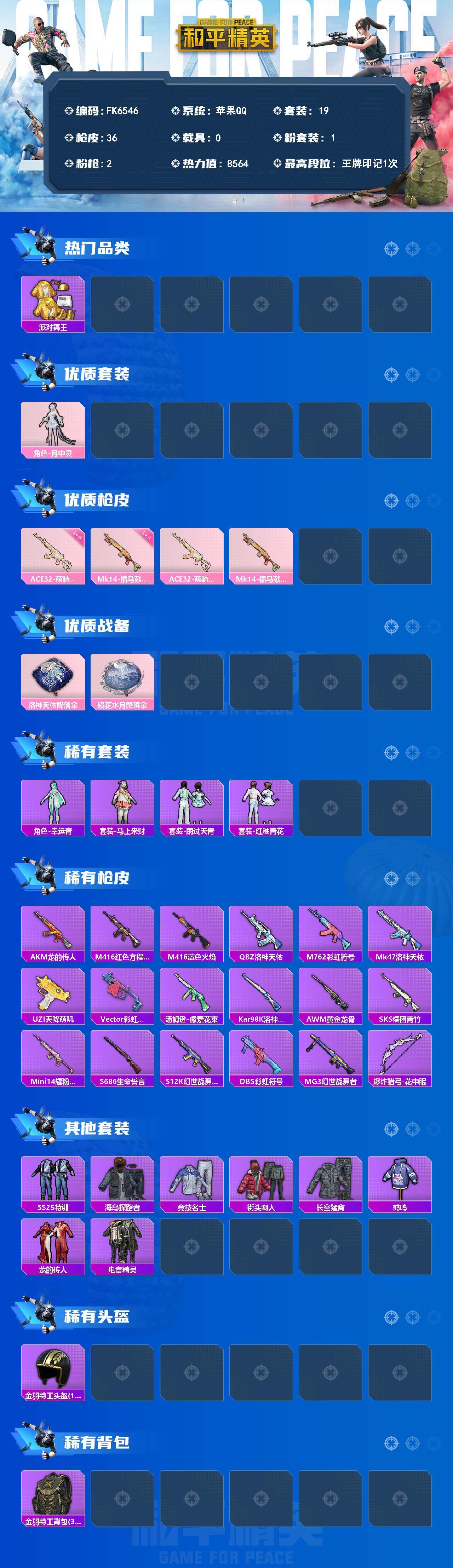 【574002】[17777104]【FK6546】19套装/枪械2/装备35/战备23/王牌印记1/热力值8564/五级ACE32-萌骑漫游/四级Mk14-福马献瑞/派对舞王/角色-月中灵/ACE32-萌骑漫游/Mk14-福马献瑞/洛神天依降落伞/镜花水月降落伞/角色-幸运青/套装-马上来财/套装-雨过天青/套装-红釉青花/AKM-龙的传人/M416-红色方程式/M416-蓝色火焰/QBZ-洛